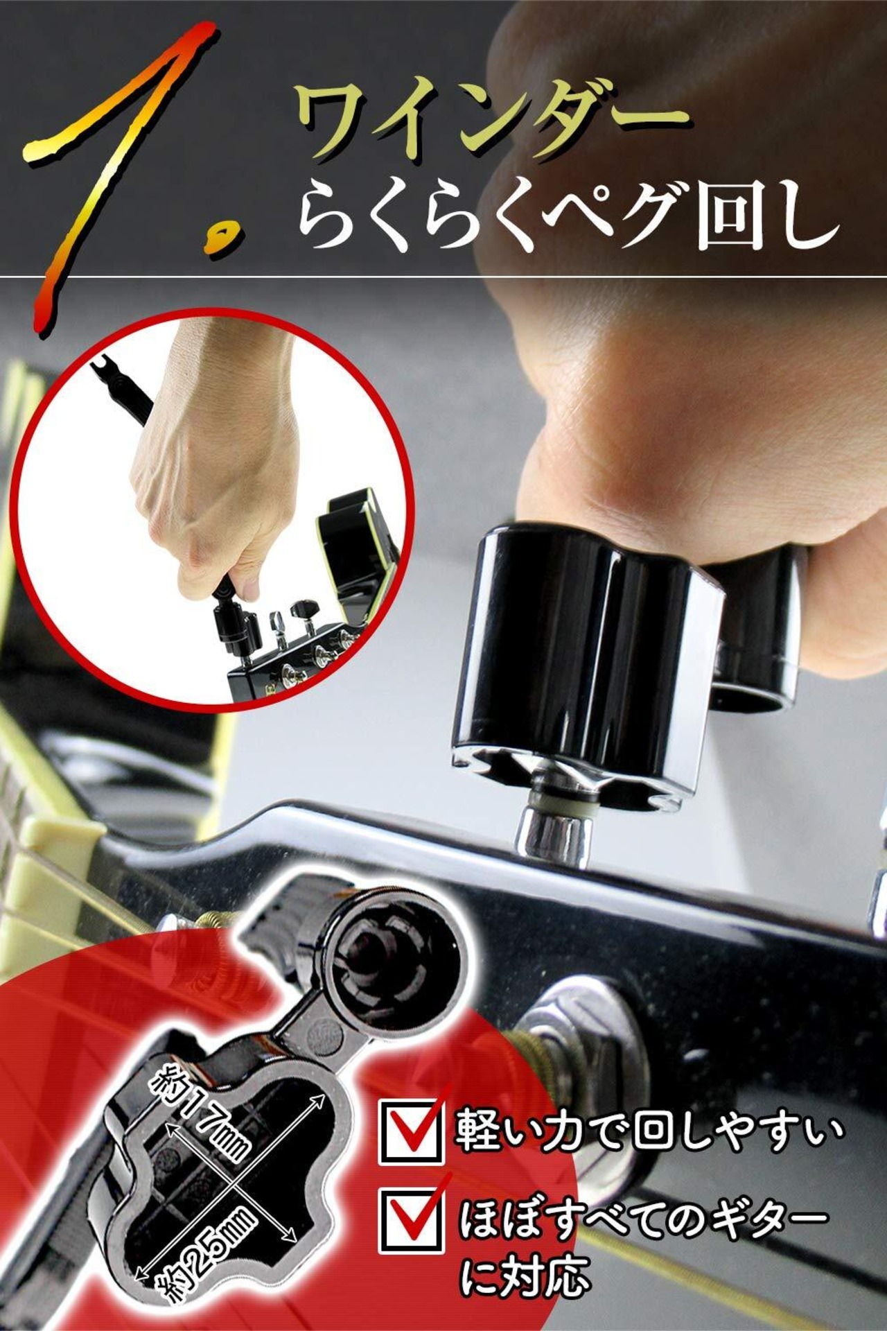 【らくらくペグ回し!】軽い力で回しやすい!形状は、ほぼ全てのギター(エレキギター、アコースティックギター、クラシックギター、バンジョー、マンドリン等)に対応。素材は耐久性あるaps樹脂。