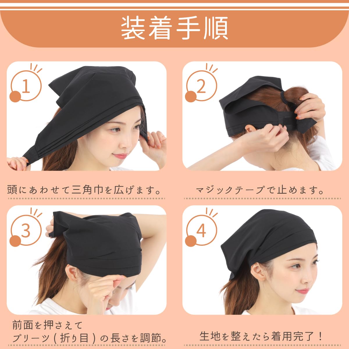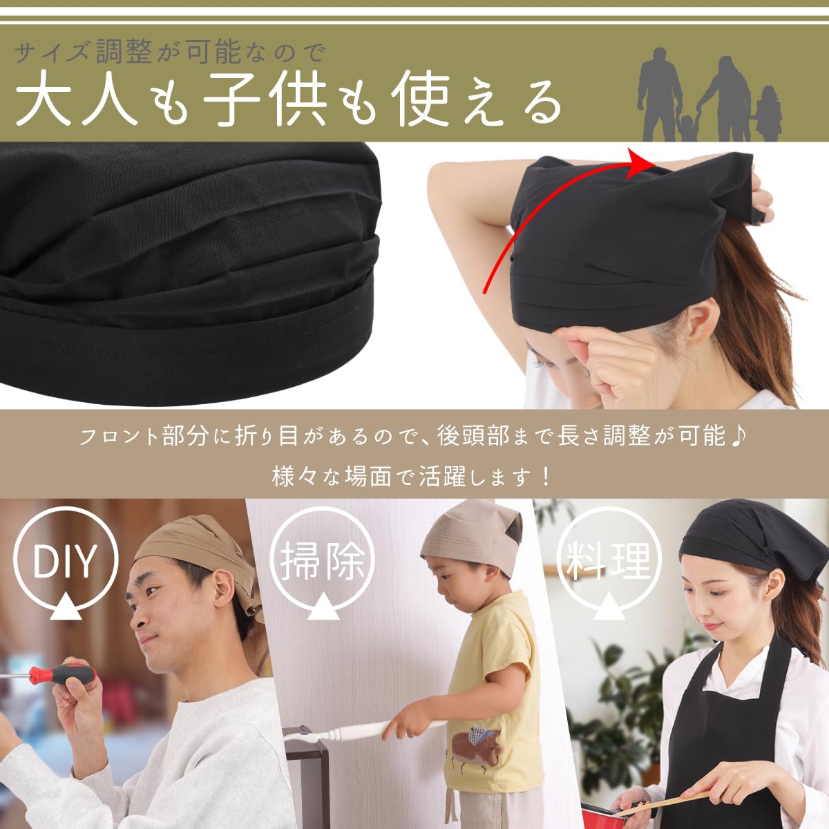 サイズ調節可能で子供も大人も使用可能。 フロント部分に折り目があるので、後頭部まで長さ調節可能。様々な場面で活躍します。