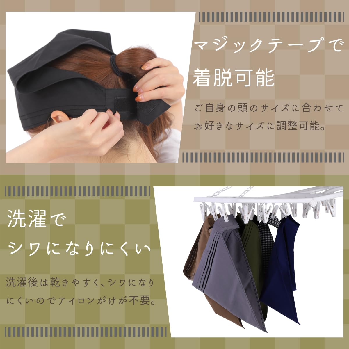 マジックテープで着脱可能。ご自身のサイズに合わせてお好きなサイズに調節可能。 洗濯でシワになりにくい。洗濯後はシワになりにくいのでアイロンがけ不要。
