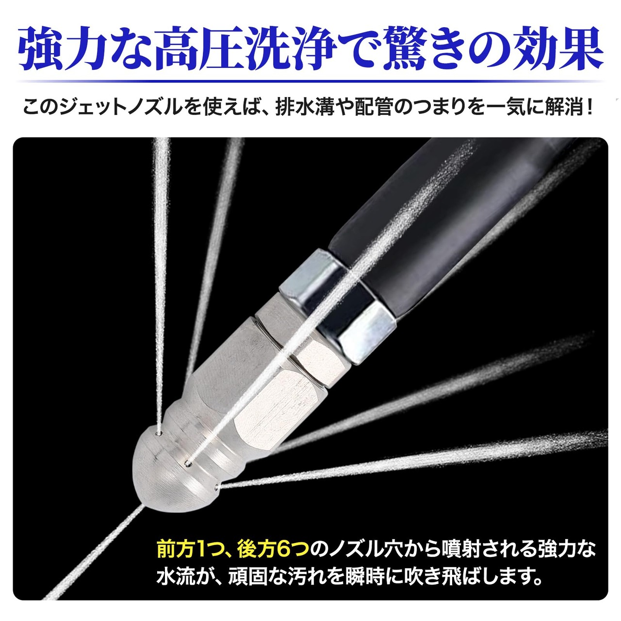 【強力な高圧洗浄で驚きの効果】このジェットノズルを使えば、排水溝や配管のつまりを一気に解消!前方1つ、後方6つのノズル穴から噴射される強力な水流が、頑固な汚れを瞬時に吹き飛ばします。