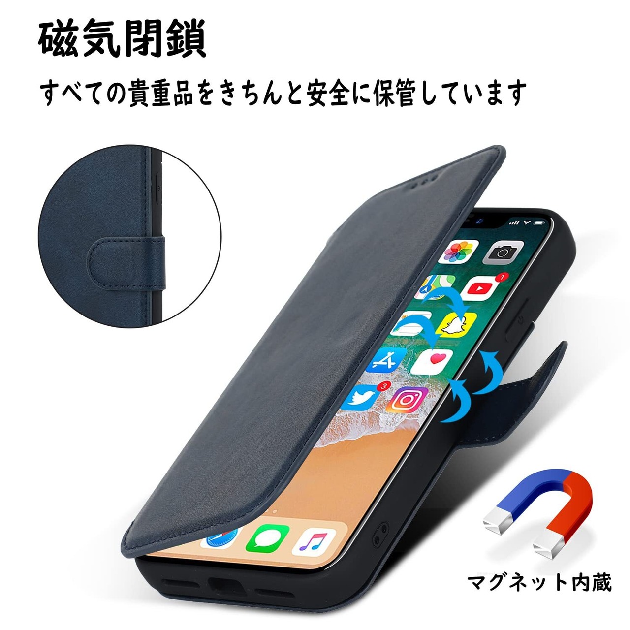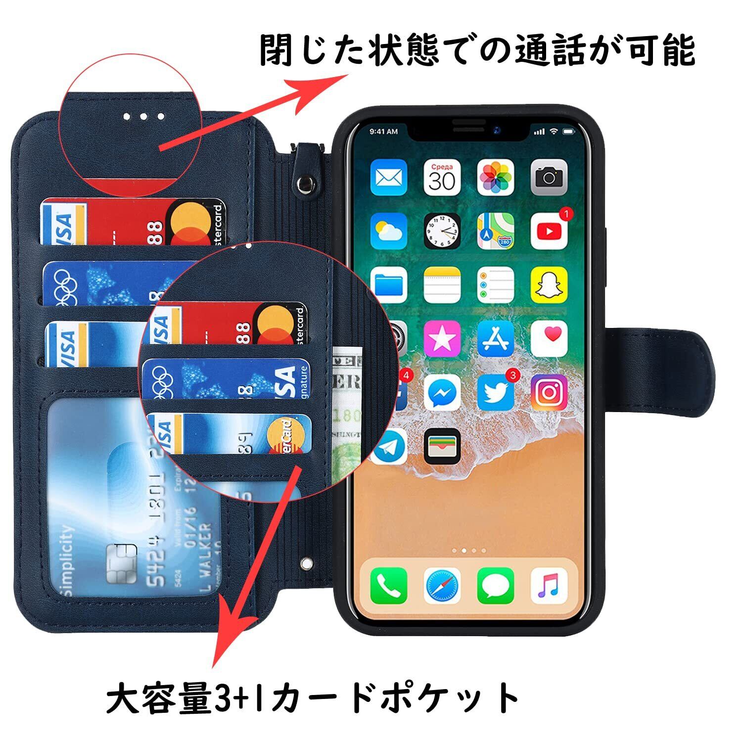 【収納機能】ケース内側に実用性のカード入れポケット×3、内側ポケット×1。また、消磁を防ぐために、カードスロットにあまり多くのカードを入れないことをお勧めします。携帯電話ケースのアップグレードでは、側面にストラップが追加され、脱落することなく手に掛けることができます。カードスロットに2枚のカードを入れると、内蔵マグネットの機能を最大限に発揮し、カードが消磁されるのを防ぐことができます。