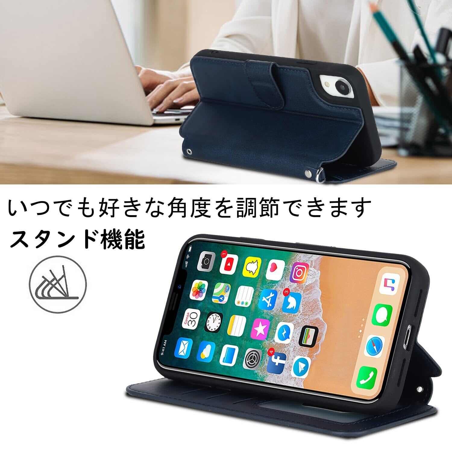 【横置きスタンド機能】マグネットが内蔵されているので、ベルトがなくてもフタがぴったり閉まります。横置きスタンド機能が付きまして、好きな角度を調節です。カバーにスピーカーホールを設置し、閉じた状態での通話を可能にしました。