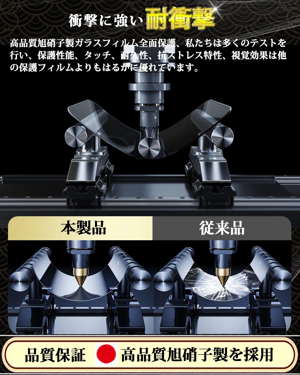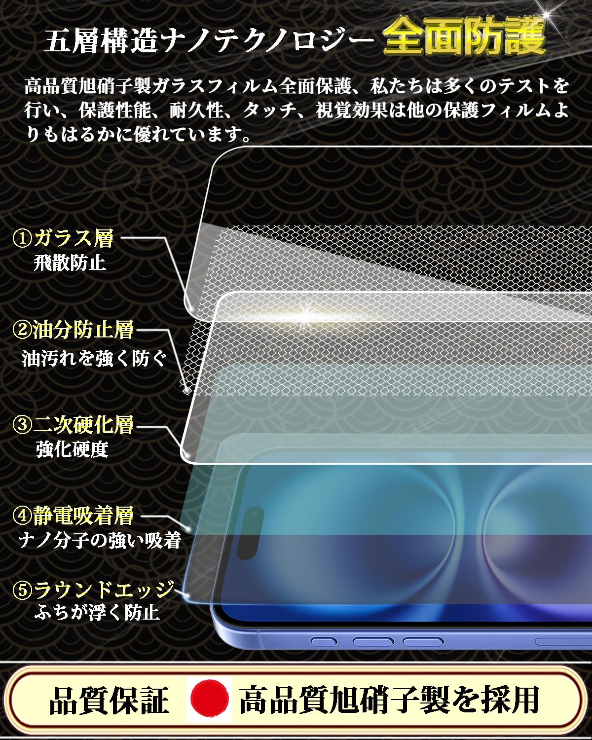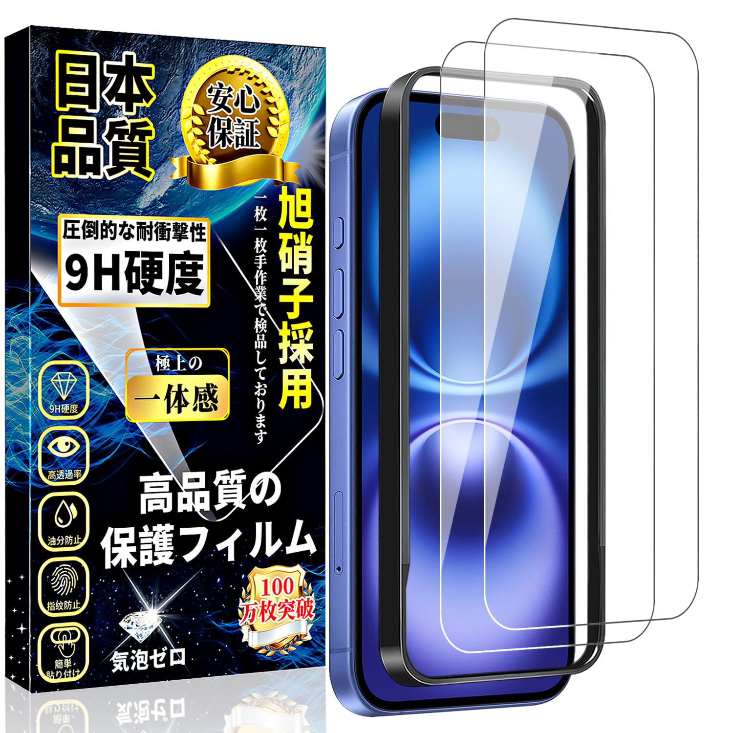 【旭硝子素材採用!対応機種】iPhone 16 ガラスフィルムは日本製の旭硝子を素材として採用し、業界最高レベルの9H硬度を持ち、耐衝撃性と耐傷性に優れています。衝撃吸収の特性により、転落とかの外力からスマホ画面への衝撃ダメージを最小限に抑えることができます。