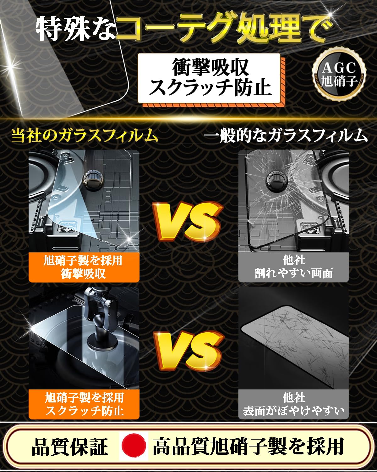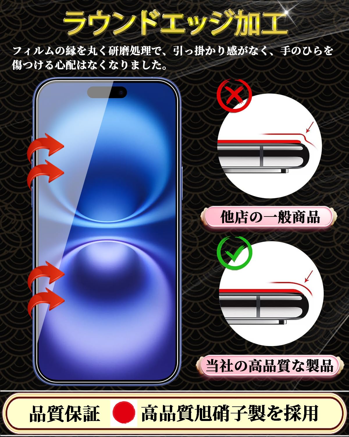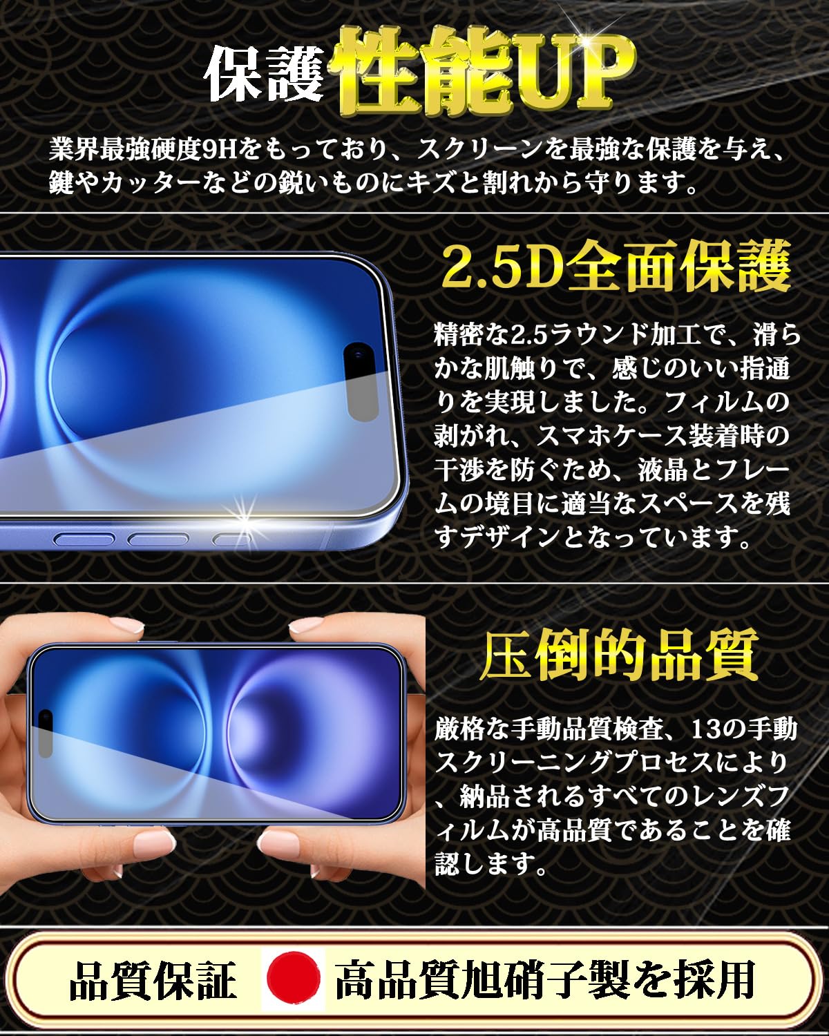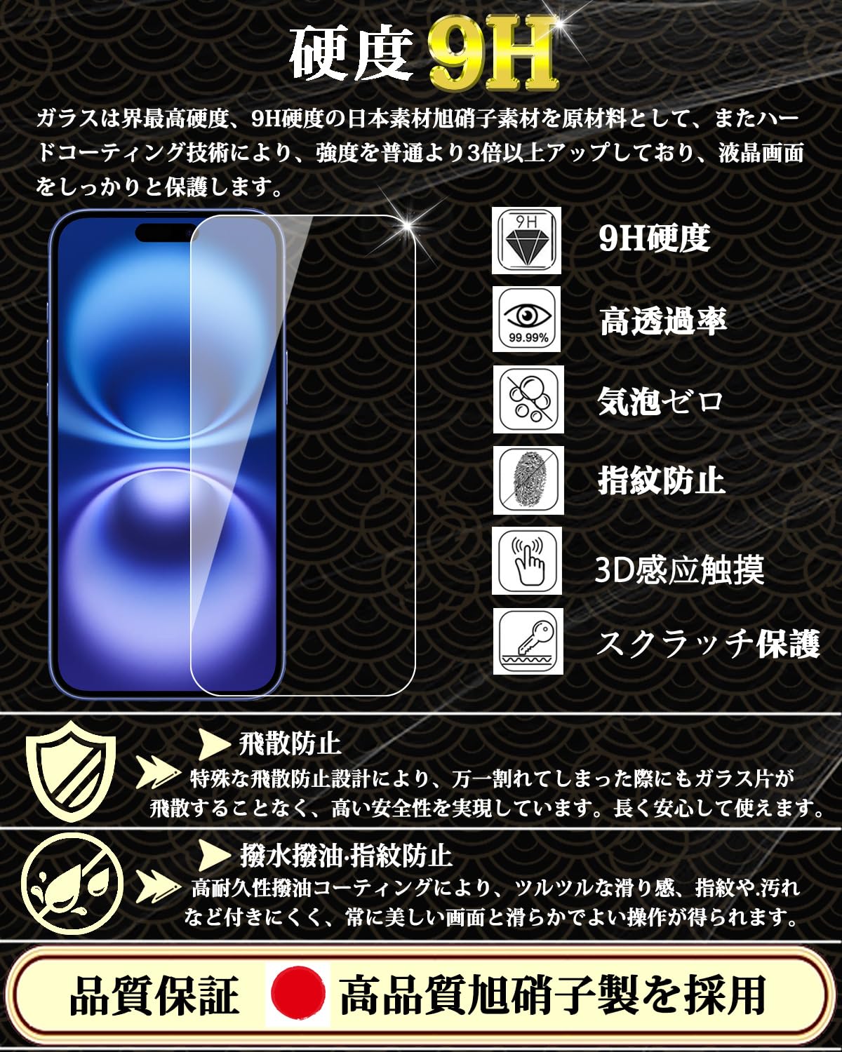特徴 9H表面硬度,飛散防止,防指紋,撥油コーティング,撥水剤,耐衝撃性,ラウンドエッジ,気泡なし,高透過率,簡単貼り付け