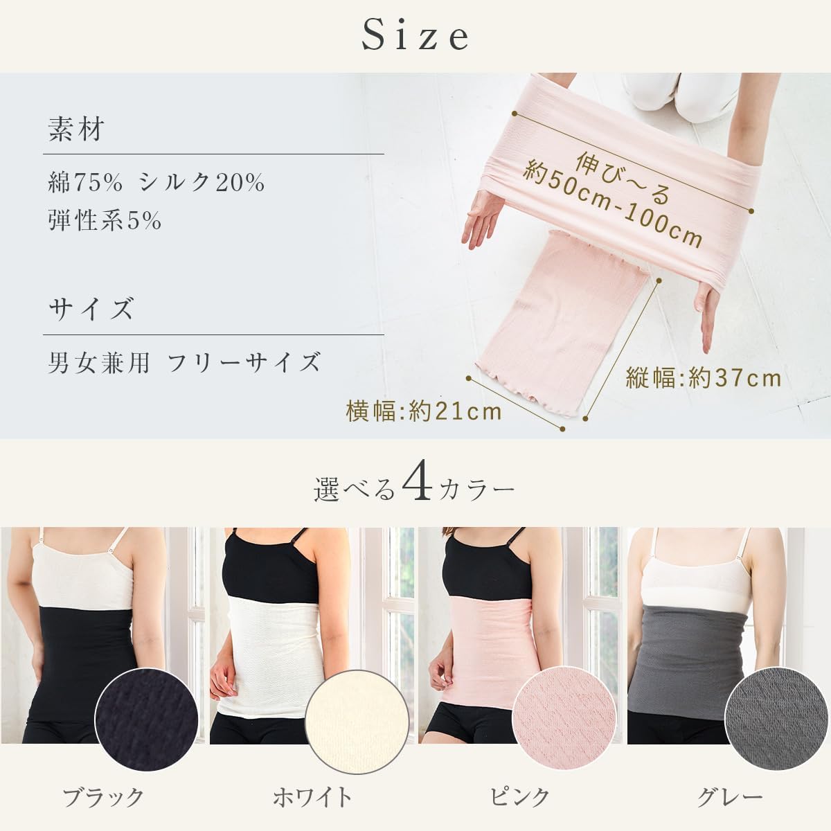 ■商品説明 多数の温活アイテムを扱うミッシーリストの大人気アイテムの「シルク腹巻」。着心地がいい上に、優秀な保温・保湿効果で冷えを防ぐので女性や妊婦さんから大人気。使い続けるうちに代謝のいい温かい身体をキープしてくれます。多くのママ向け雑誌やメディアでご紹介いただいる理想のインナー「シルク腹巻」は、縫い目がなく着心地が良い。伸縮性が良くストレスフリー。温かいのに薄く、着ぶくれしない。洗濯機で洗えるためお手入れも簡単。このように、1年中美容や健康のために「温活」を続けてほしいからこだわりの特徴が多くあります。また、ミッシーリストで扱うシルクは日本でわずかしかない特殊な機械を使って丁寧に編み上げて作られています。秋冬の冷え対策だけでなく、春夏の冷房対策にも最適です。シルク腹巻のカラーバリエーションはブラック(黒)、ピンク、ホワイト(白)・グレーからお選びいただけます。 (複数枚ご購入の場合、旧パッケージと新パッケージの商品が混在する場合がございます。 商品は同一のものですのご安心くださいませ) ■原材料 綿75%、シルク20%、弾性糸5% ■サイズ ウエスト約50センチ~100センチ(大きく伸縮します) ■カラー ブラック・ピンク・ホワイト・グレー ■原産国 日本