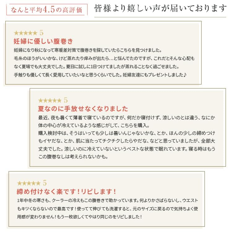 【柔らかく締め付け感ゼロ】よく伸びてお腹を締め付ける事がなく妊婦さんにおすすめ。冷えがたまりやすい腰回りもポカポカして冷え対策にもなります。妊娠後期にウエストが1メートルになった妊婦さんでも、柔らかく包みこんでくれる着心地に満足いただけます。薄くて軽く、よく伸びるから、マタニティーインナーとしても人気です。伸縮性がかなりあるので、ウエストが約50センチから100センチまで対応しています。