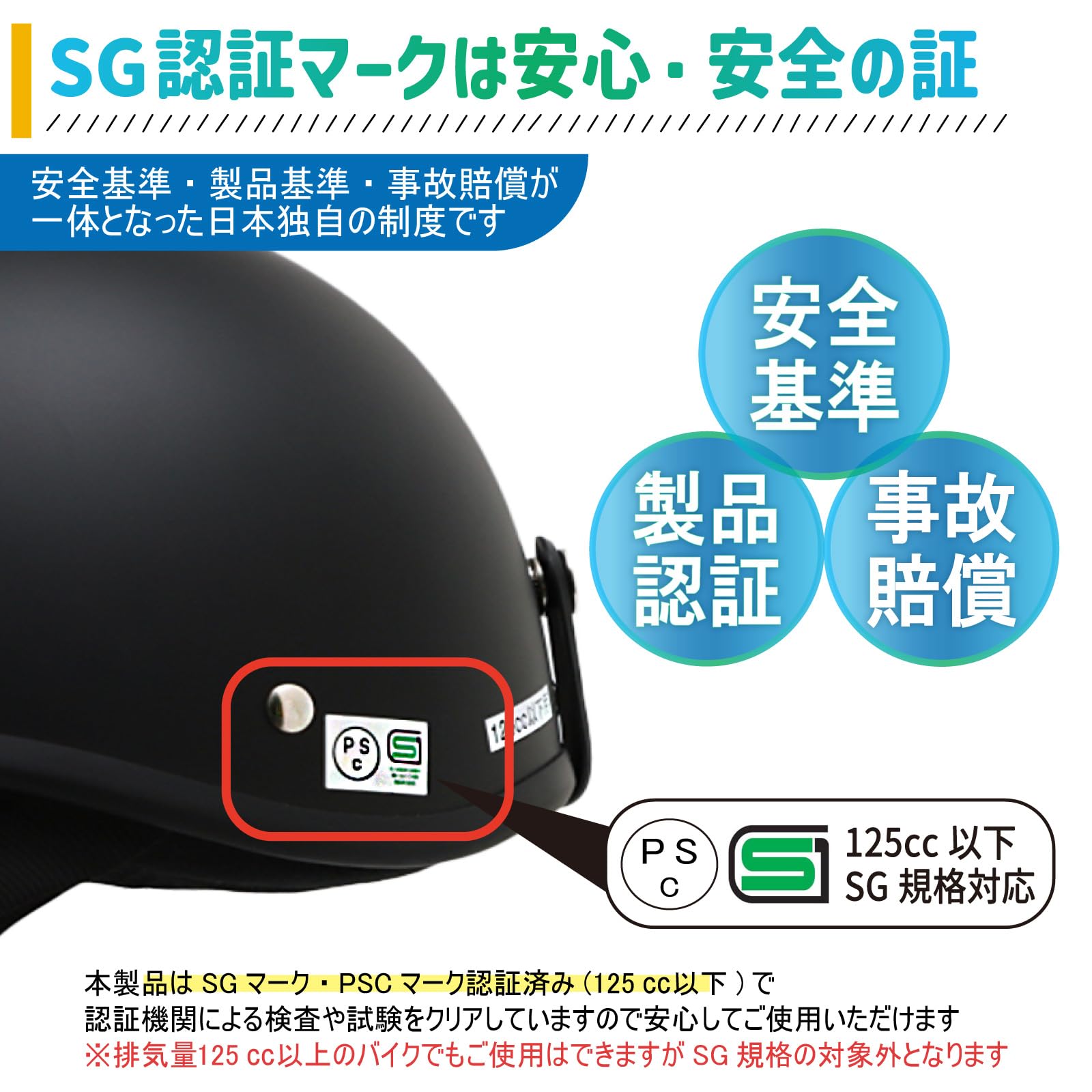 日本基準適合:このバイクヘルメットはSGマーク・PSCマーク認証済み(125㏄以下)で、認証機関による検査や試験をクリアしているため安心してご使用いただけます。
