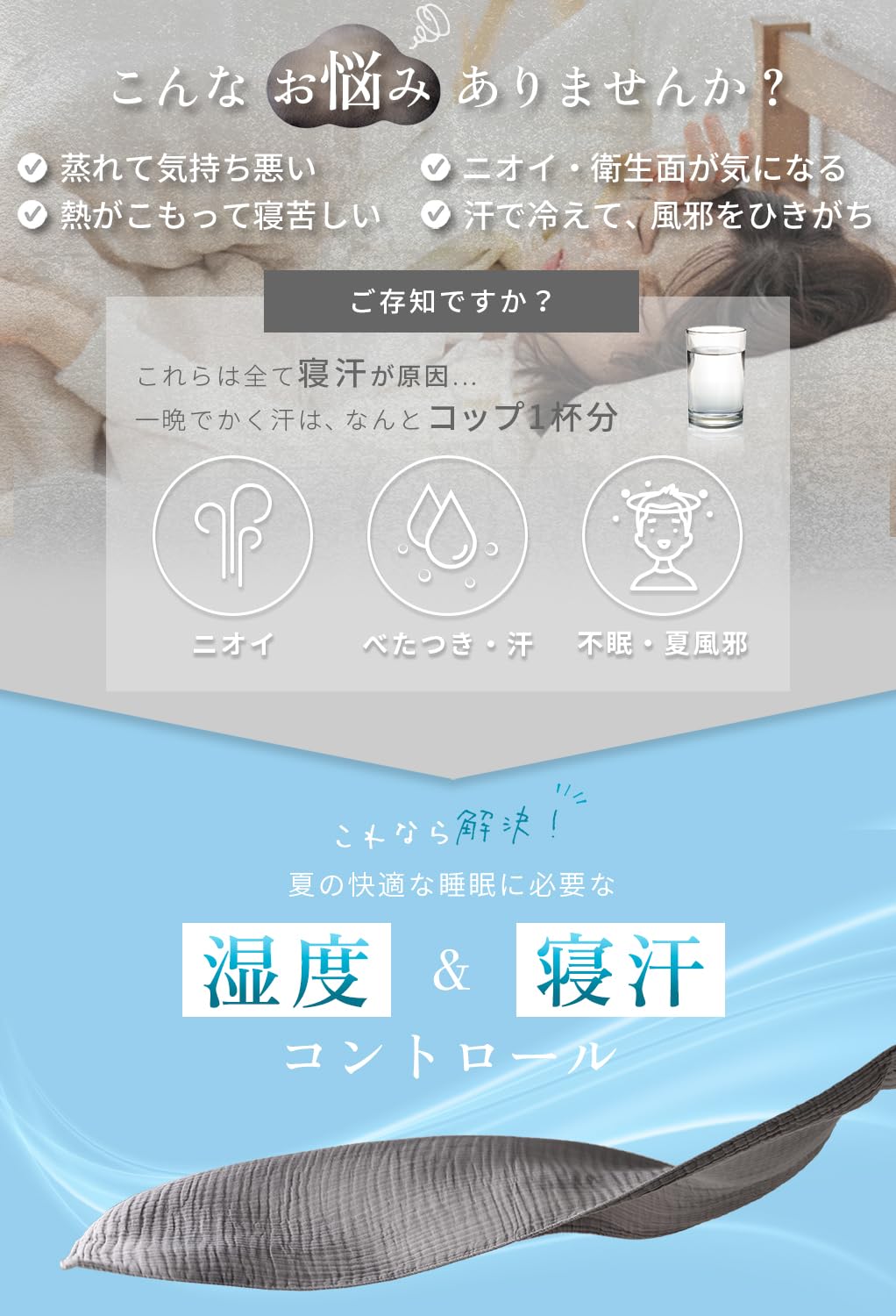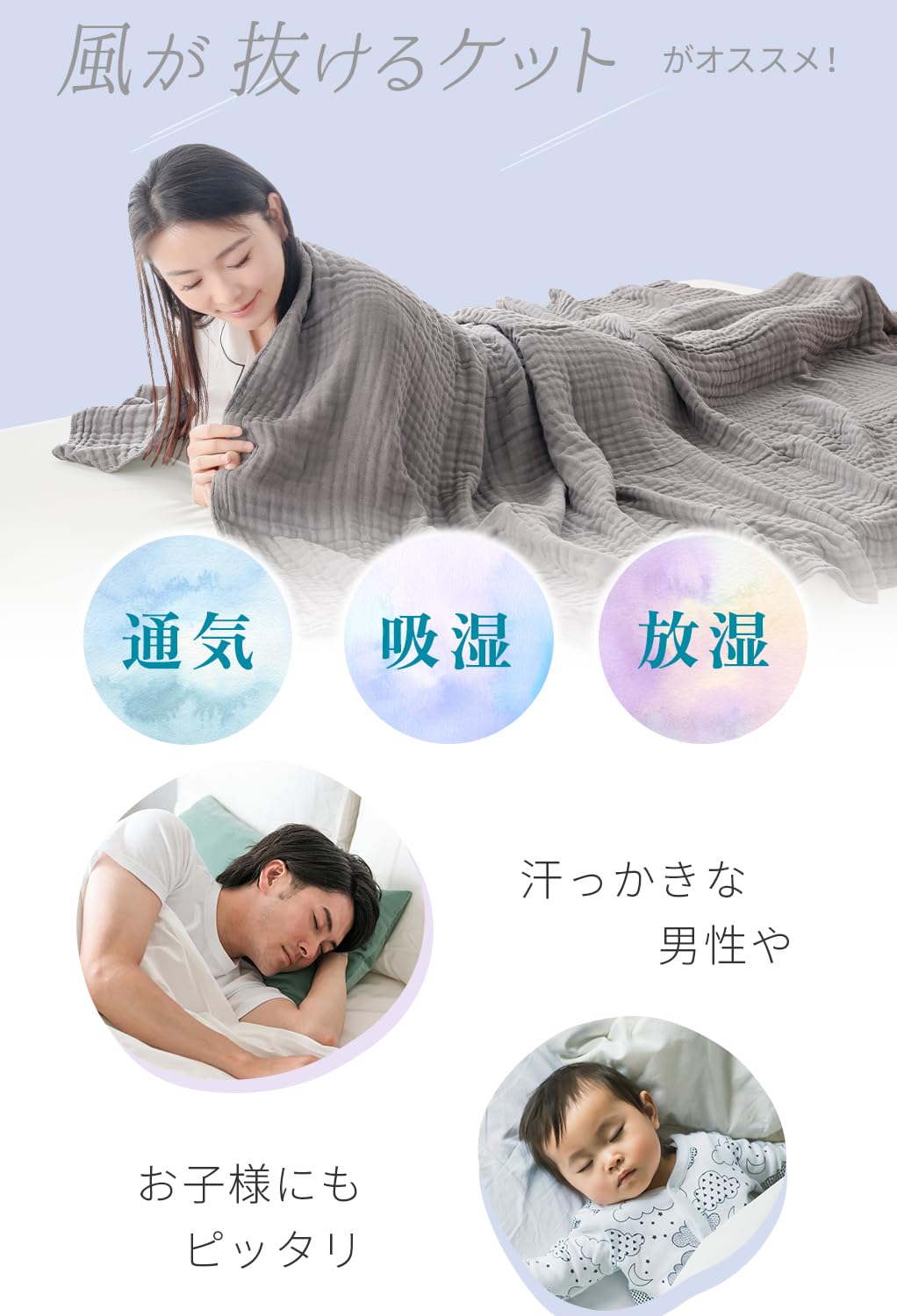 【優れた通気性】汗でべたつく肌をさらりと快適に。吸水性、通気性ともに優れているので、汗ばむ夏の夜でも快適にお使いいただけます。