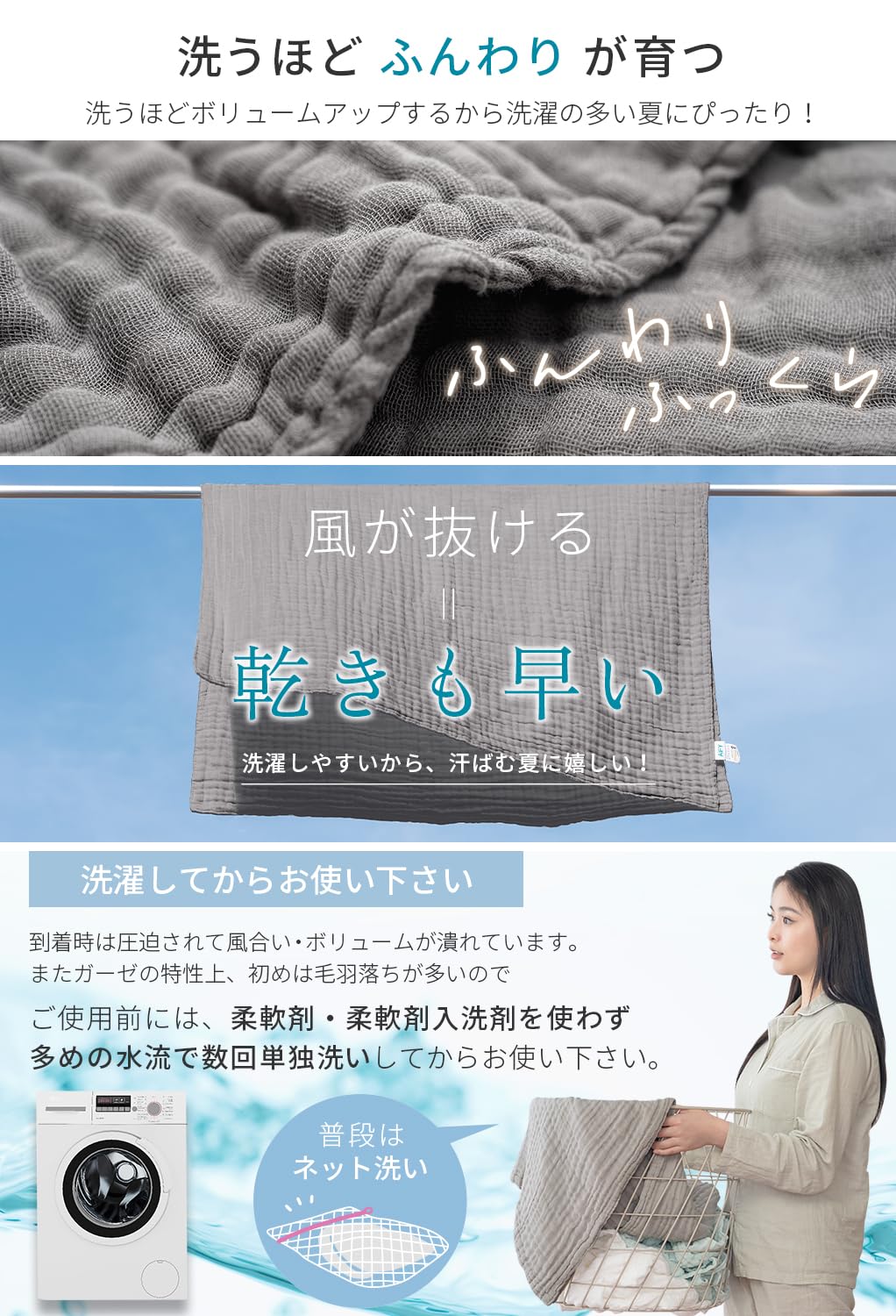 【洗濯機対応】洗うたびにふんわり育つ。洗うほど使い込むほどにふんわり優しく育ちます。肌なじみがよく、タオルケットとはまた違った風合いも魅力のひとつ。縫製のあとの洗浄でシワを丁寧に作っていきます。洗浄時に計算された時間と水温で洗うことによって肌にちょうどよくなじむ、くしゅくしゅ感が生まれます。※ご自宅で洗濯ネットに入れ洗濯可能!