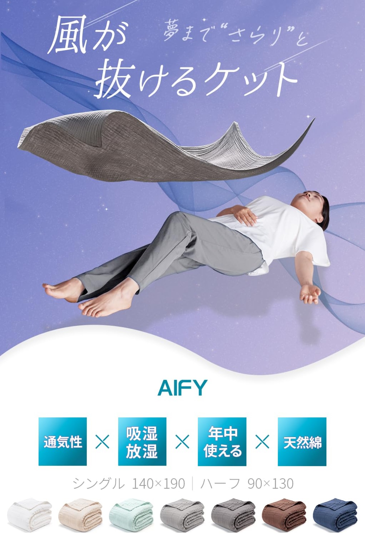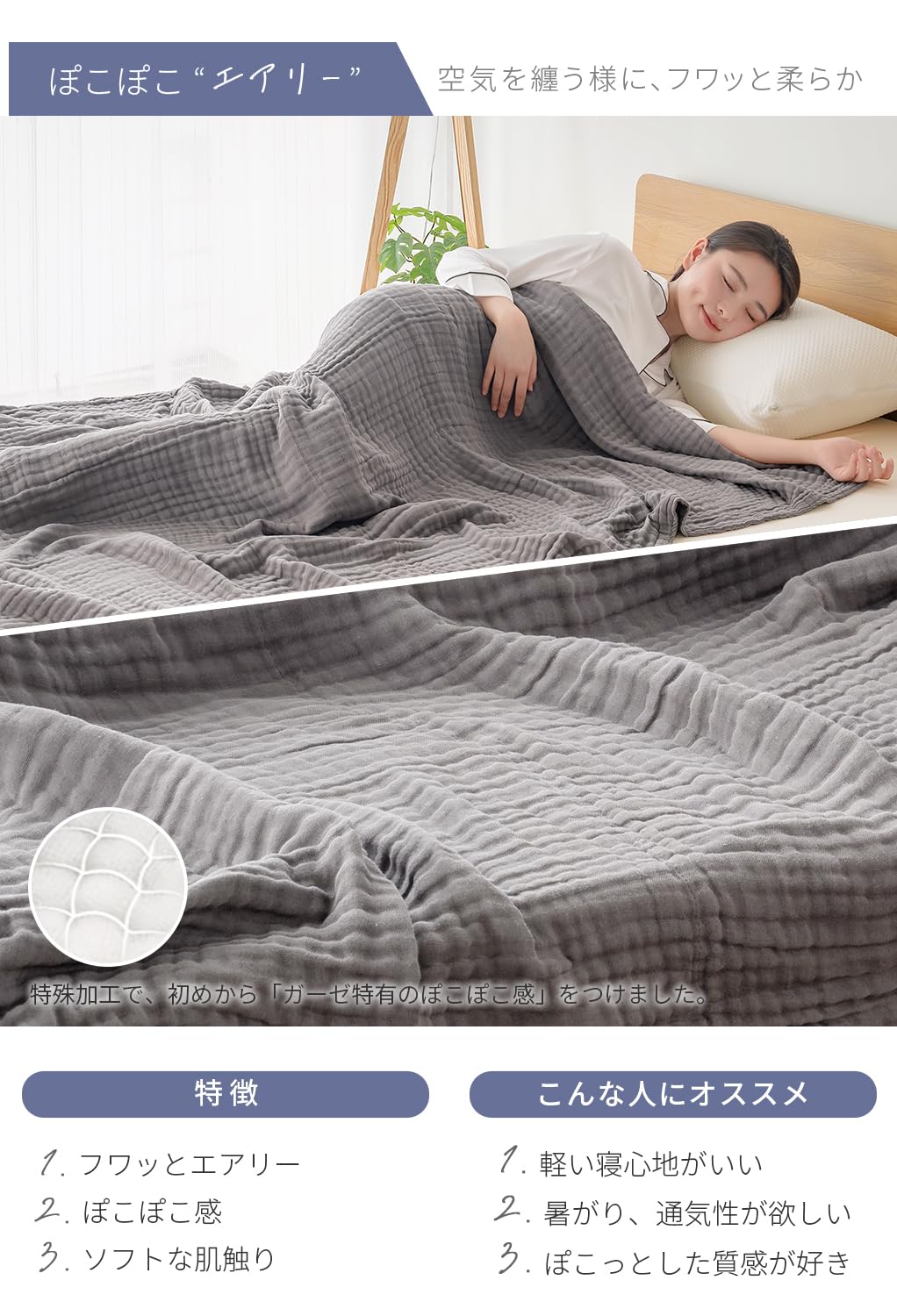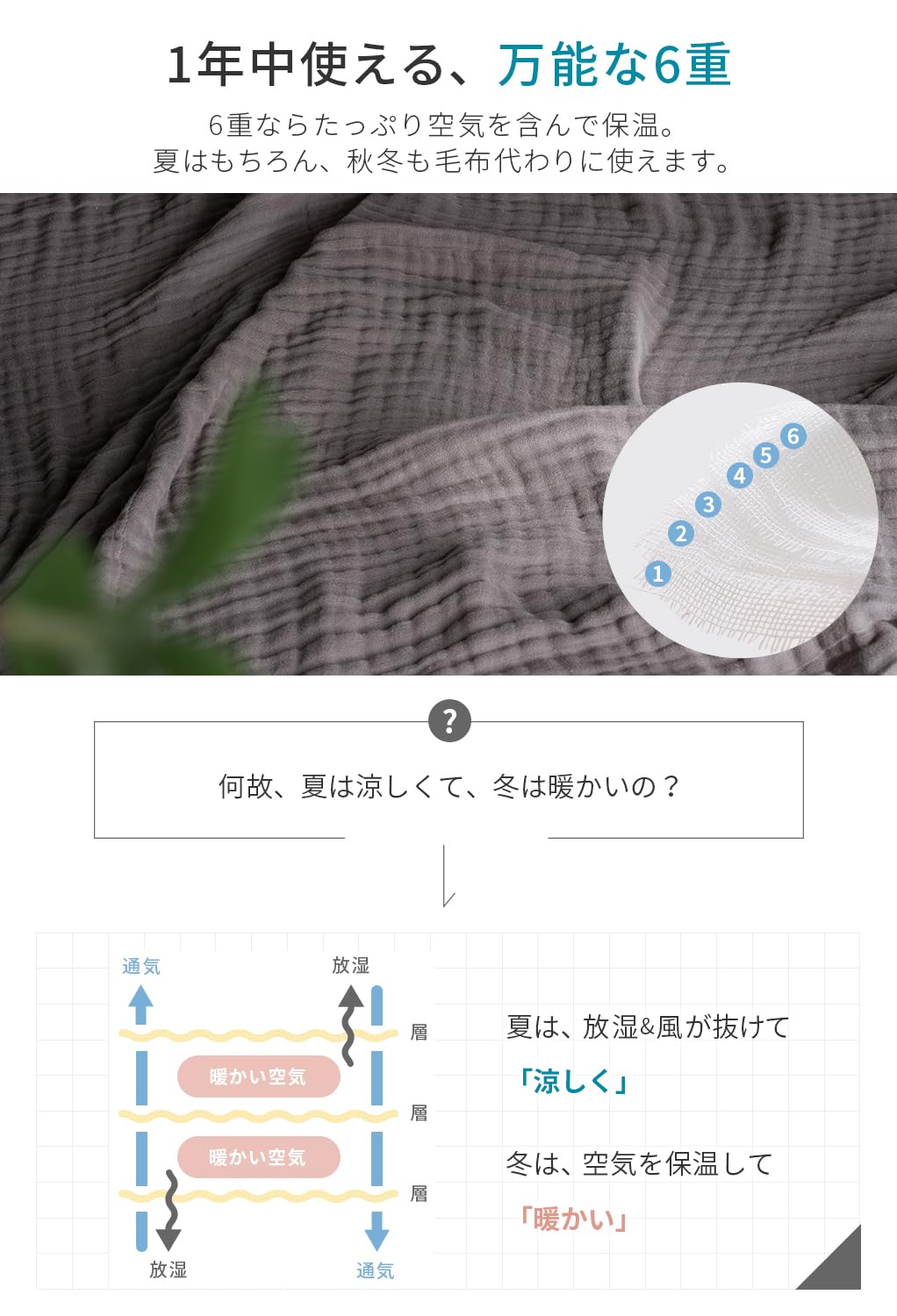 【冷房対策】心地よい眠りを誘う6重ガーゼ。ガーゼ生地を6重にしたことでやわらかい肌触りと、適度な通気性を実現。春から夏にかけて長くお使いいただけます。夏場の冷房対策、熱帯夜でも快適にお使いいただけます。