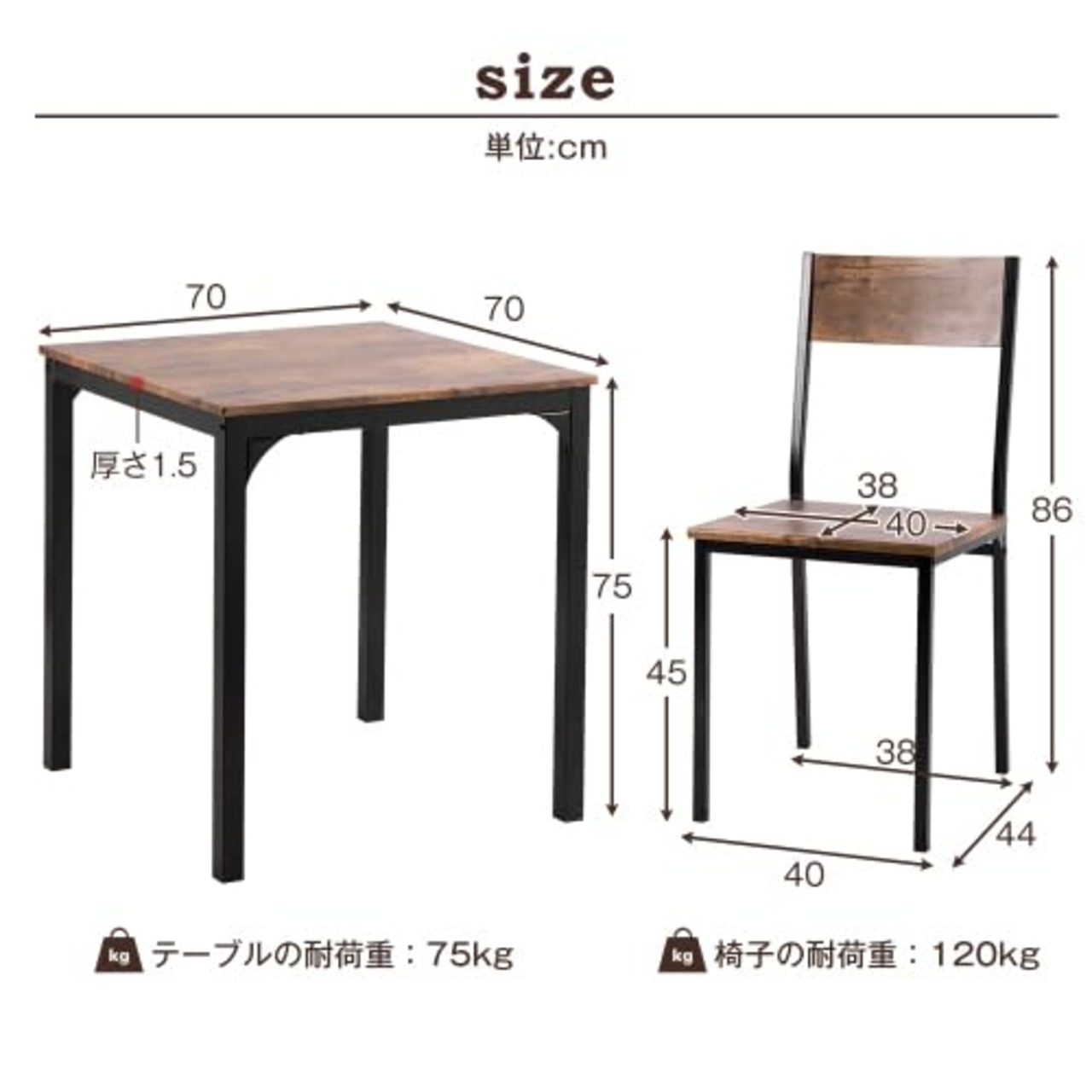 円形テーブル1卓と椅子2脚のセット お部屋の空間を邪魔せずに、でもお料理もたくさん載せられる、ちょうどいいテーブルセットです。ご夫婦で使用するにもぴったりのサイズです。 幅約53cmのコンパクトサイズで場所を取りません。 お店のカフェスペースを思わせるオシャレなデザイン。 単身もしくは二人暮らしなど、 “ダイニングで場所を取りたくないけど 食事のスペースが欲しい” という方におすすめのダイニングセットです。 椅子1脚の重量は約3kg、テーブル1卓の重量は約6.52kgとなっており、女性でも簡単に運べます。 PVC塗装は丈夫で汚れにも強く、汚れても布でサッと拭き取るだけでお手入れも簡単。 テーブルの脚部分には強度を上げるためのバーを設置。 テーブルの下には、雑誌などのちょっとした日用品を収納できるスペースをつけました。 フレーム部分は紫外線による色褪せやサビ付きを防ぐためにパウダーコーティングを施しています。