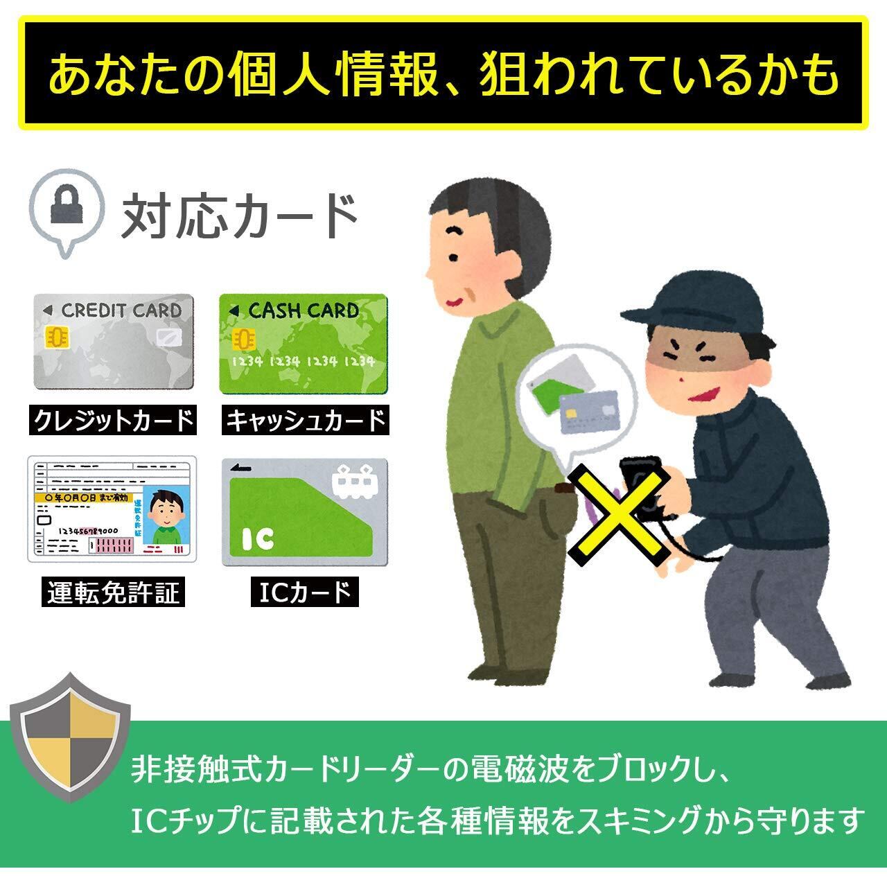 『スキミング防止機能』 スキミング防止シートを内蔵しているので、不正アクセスからあなたの大切な個人情報や財務データを守ります。日常では満員電車やエレベータの中など(人が密集した場所)、海外旅行中でも街中で被害にあう可能性があります。電子マネーの浸透に伴い、現金以外のキャッシュレス決済が身近に活用されて利便性が高まった日本だからこそ、隠れたリスクに応じたスキミング防止対策は非常に重要になります。