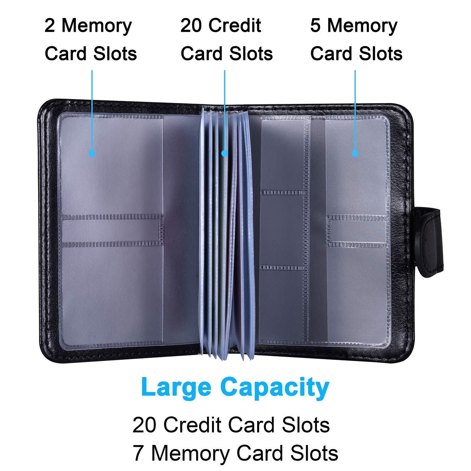 【抜群な収納力】クレジットカード20枚(裏表2枚シートx10ページ)とメモリカード7枚(SD・CF・TF用)を同時にうまく収納できて、わざわざメモリカード専用のケースを購入する必要も要らないです。