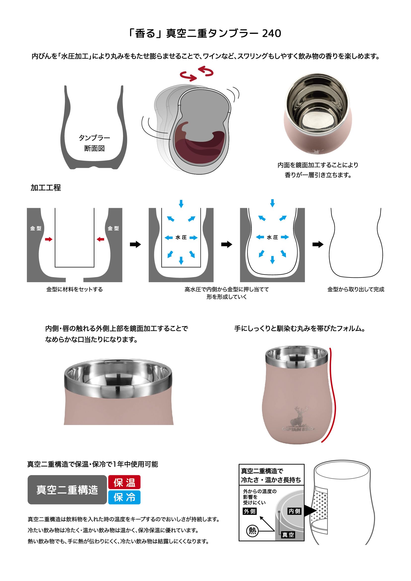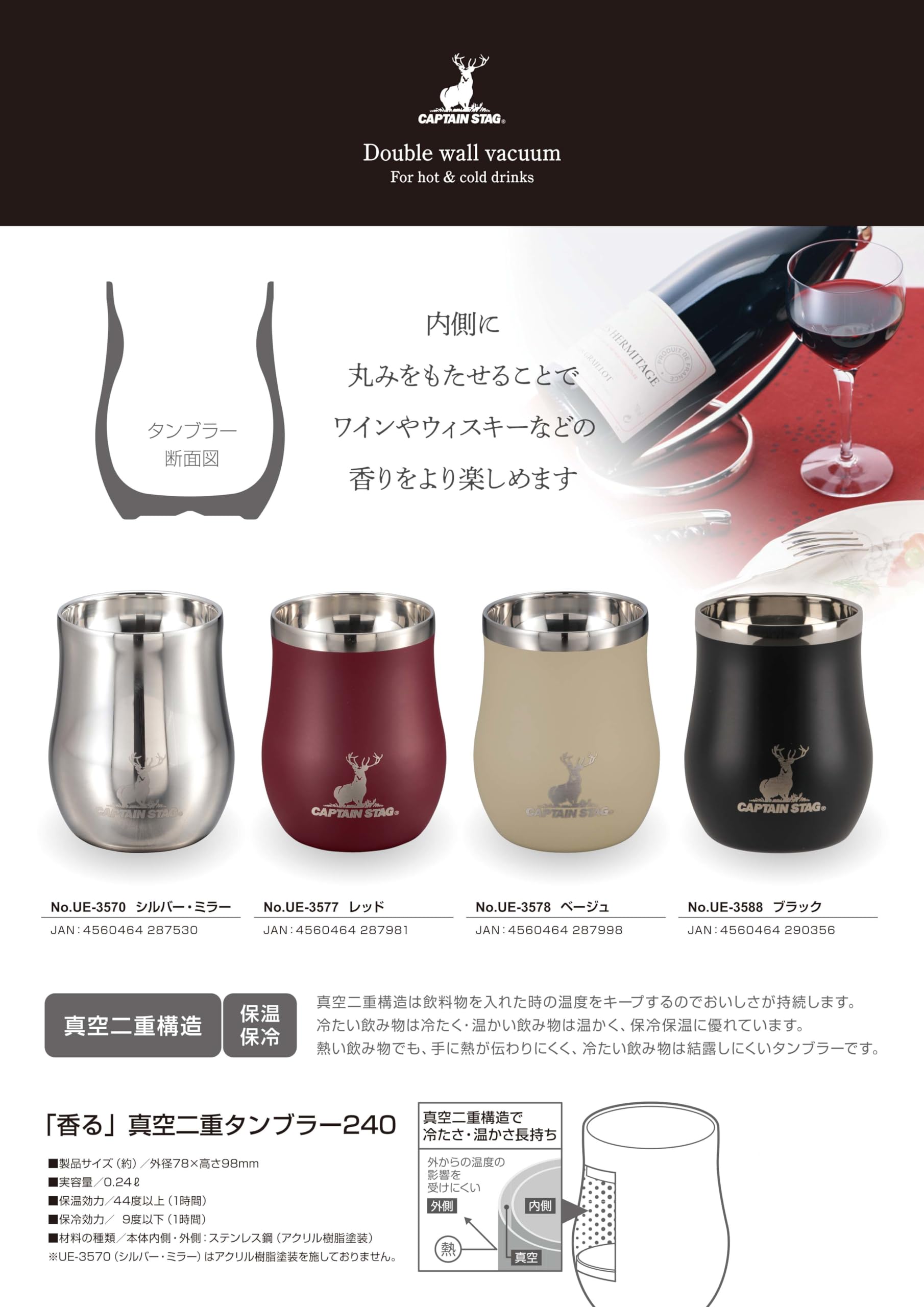 キャプテンスタッグ(CAPTAIN STAG) アウトドア コップ マグカップ マグ カップ タンブラー 香る 真空二重タンブラー 240ml 保温保冷 ステンレス製