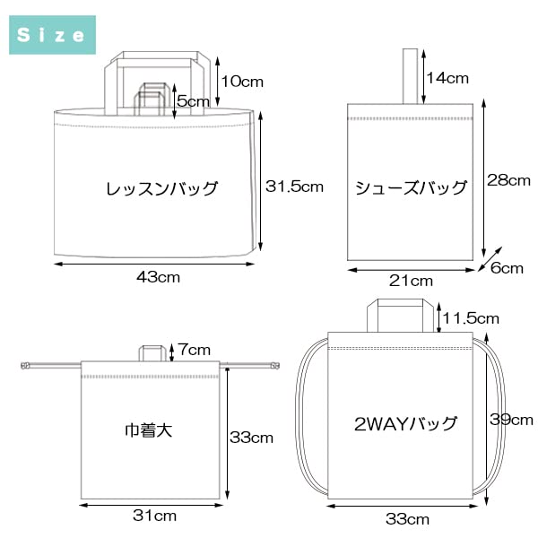 サイズ レッスンバッグ:約W43×H31.5cm、シューズバッグ:約W21×H28×D6cm、2WAYバッグ:W33×39cm、巾着大:W31×H33cm *すべて平置きのサイズ