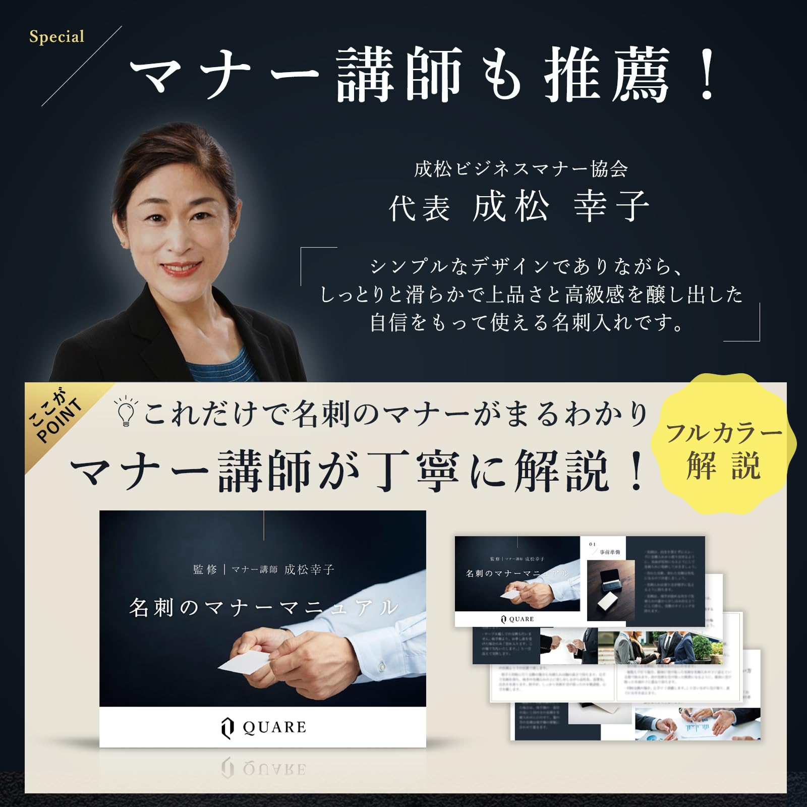 【マナー講師も推薦】 「吸いつくようなしっとりとした滑らかな質感が、上品さと高級感を醸し出し、シンプルなデザインを引き立てています。ポケットは4つ、受け取った名刺と混ざらず収納できる工夫がされており、名刺交換の多いビジネスパーソンに相応しい名刺入れです。」