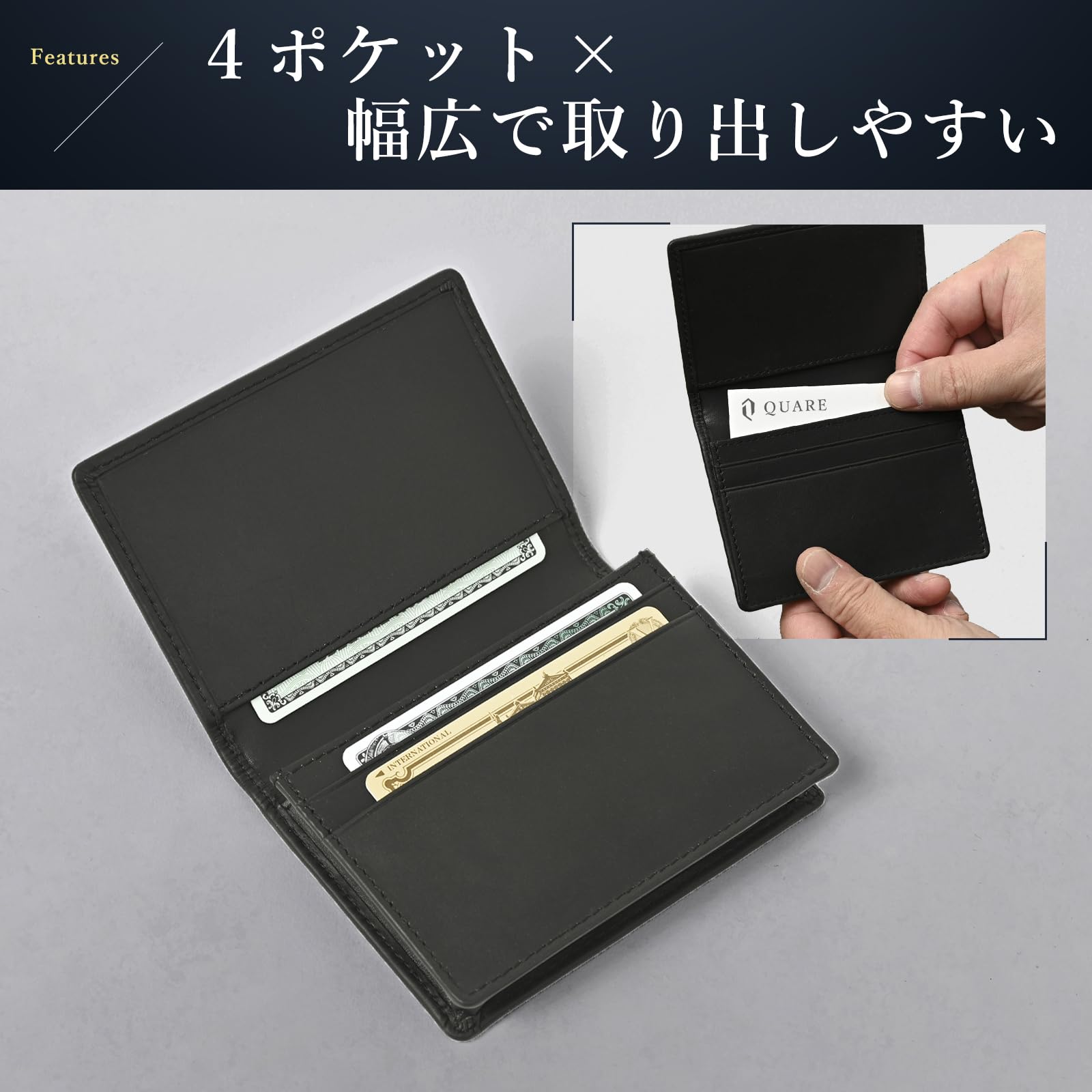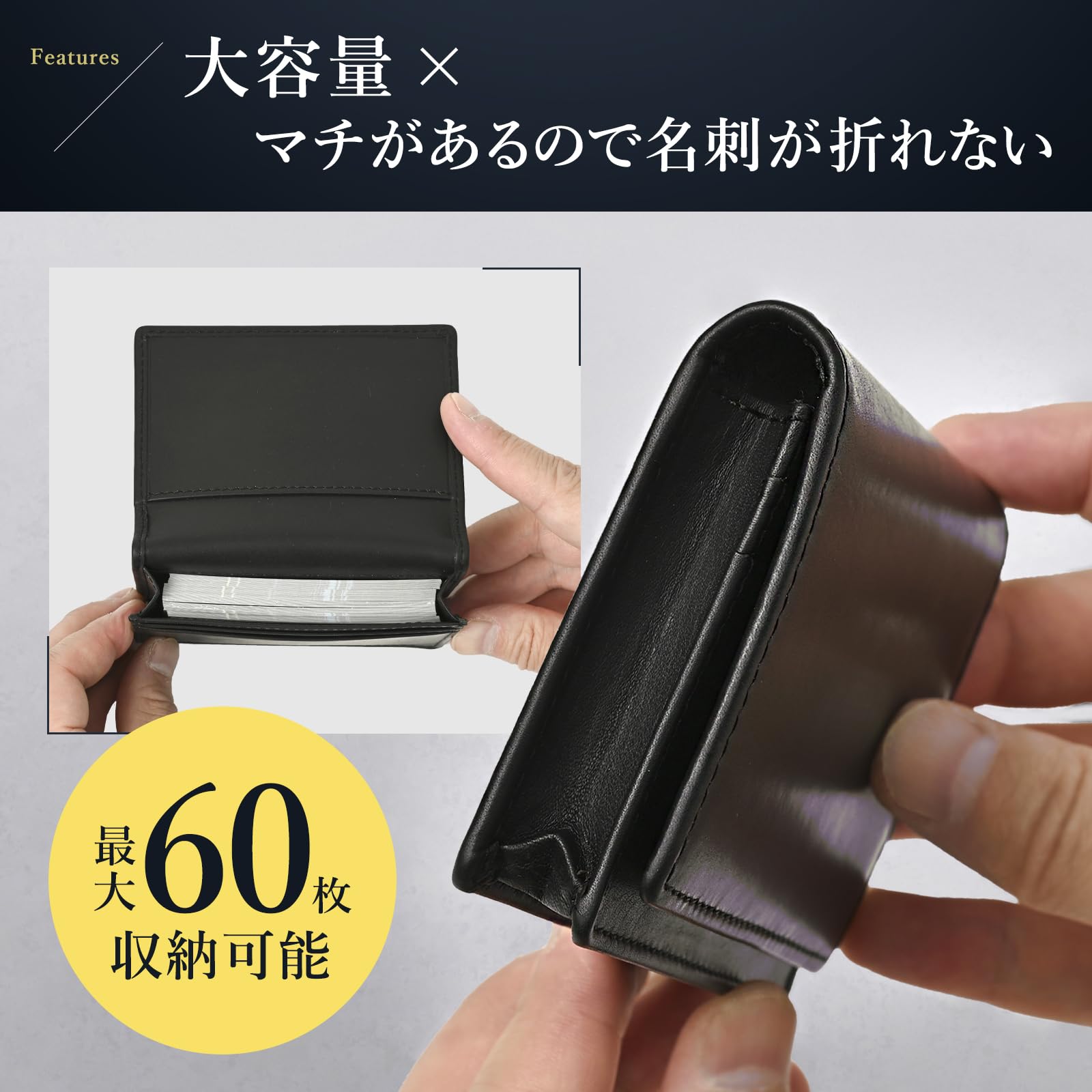 【名刺の角が折れない】 マチがあるので名刺が折れる心配がありません。大容量で最大60枚の名刺を収納可能です。取り出し口は幅広タイプのため名刺交換時に名刺をスムーズに出し入れすることができます。また、名刺入れポケット以外に、3ポケットあるので、クレジットカードやお札なども収納出来ます。