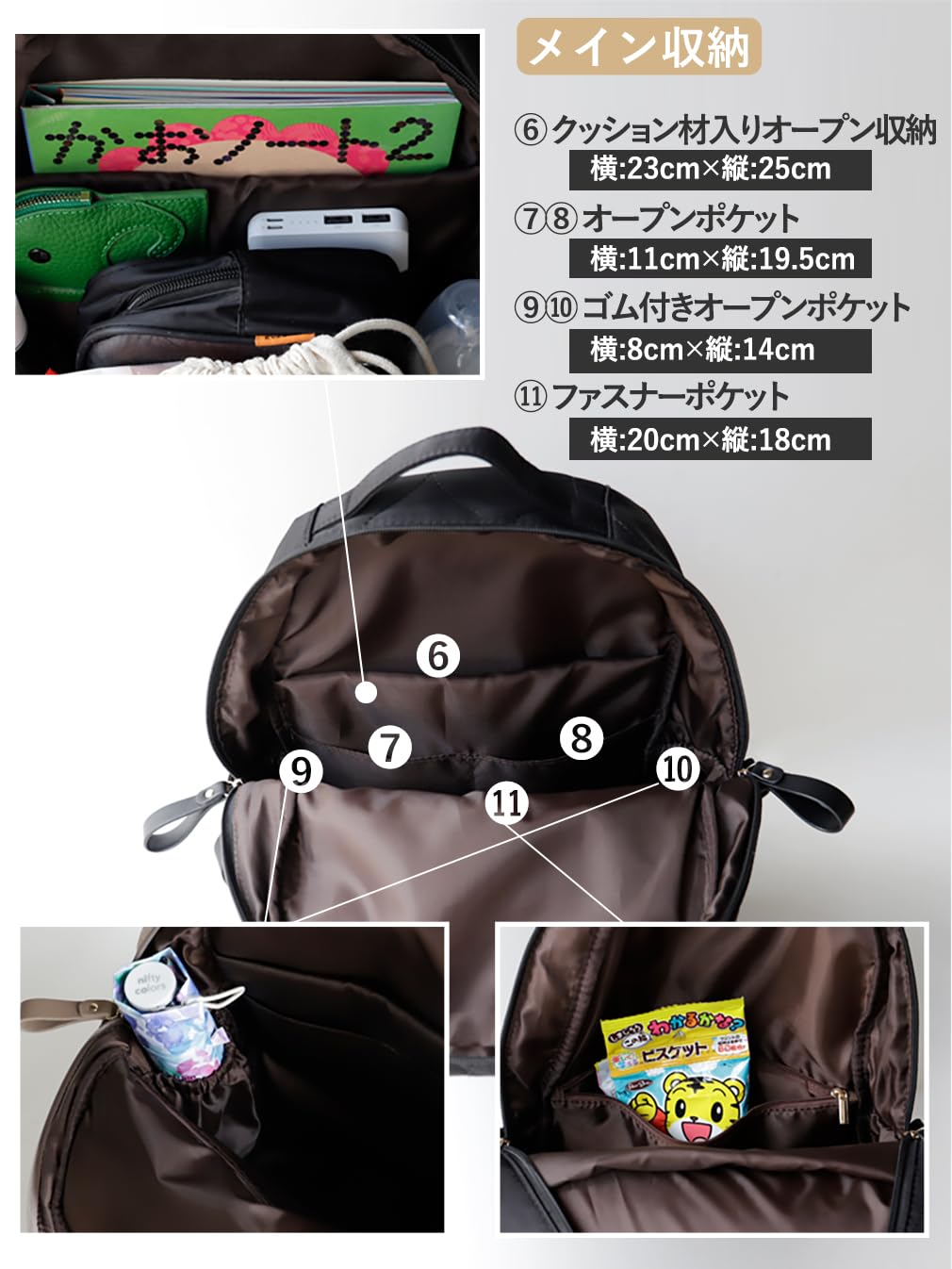 メイン開閉はファスナーで、サイドまで大きく開きます。 ▼前面 ファスナーポケット×1、ファスナーポケット×1、ファスナーポケット×1、オープンポケット×1 ▼側面 オープンポケット×2 ▼背面 マグネットポケット×1、オープンポケット×2 ▼内側 クッション材入りオープンポケット×1、オープンポケット×2、ゴム付きオープンポケット×2、ファスナーポケット×1