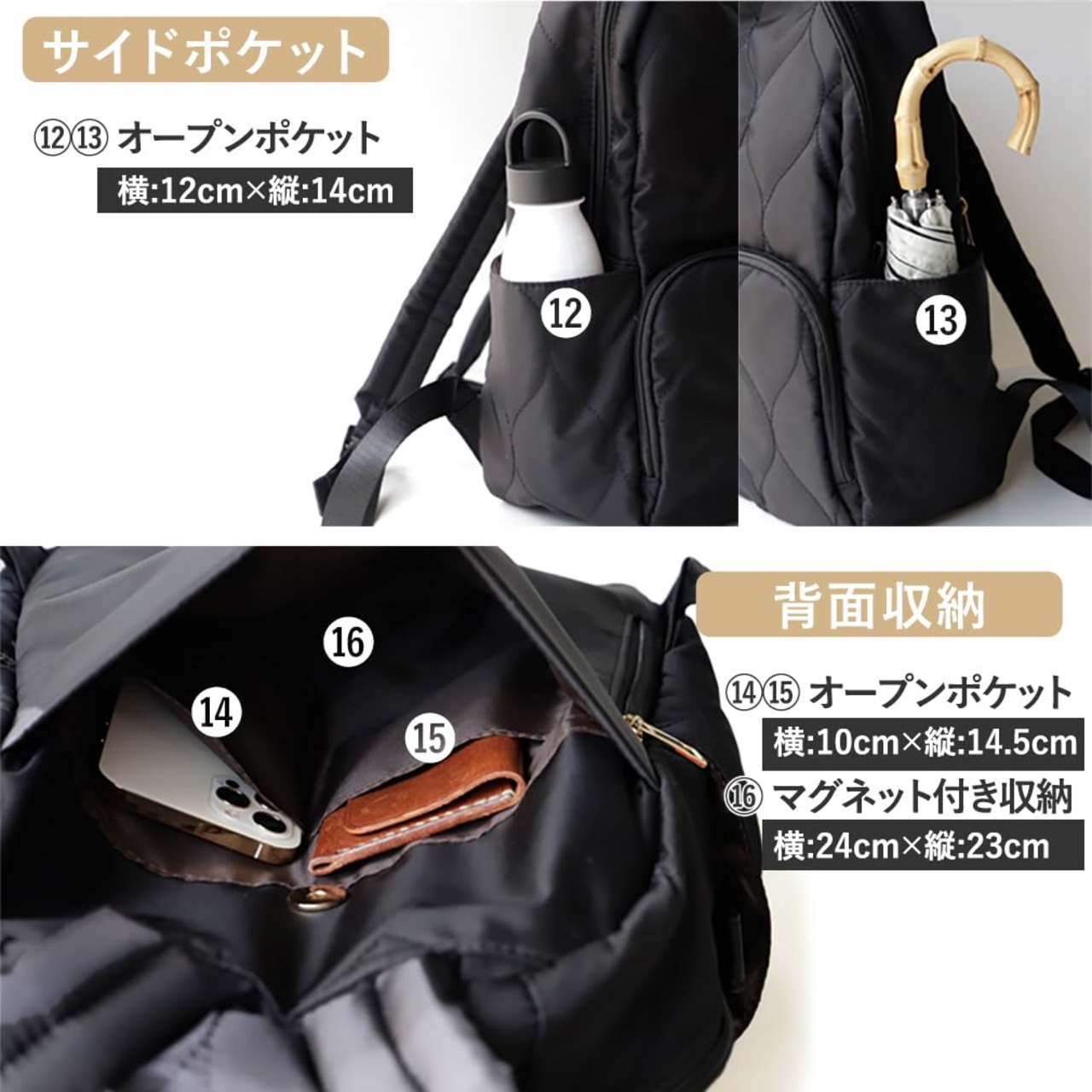 ●SIZE:高さ:約38cm / 幅:約16cm(上辺)約27cm(下辺) / マチ:約14cm ●ハンドル長さ:約14cm×幅:約2.4cm、ハンドル高さ:約3cm ●ショルダーベルト長さ:約40~83cm×幅:約4cm(取り外し不可能/調節可) ●外ポケット:前面ファスナー付きポケット1、(内にオープンポケット1、ファスナー付きポケット3)側面オープンポケット2、背面マグネット付きポケット1(内にオープンポケット2) ●内ポケット:オープンポケット5、ファスナー付きポケット1 ●バッグ重量:約515g ●素材:高密度ナイロン ●バッグのメイン開閉口はファスナーになっております。 ※背面に内ポケットに繋がるファスナー付き
