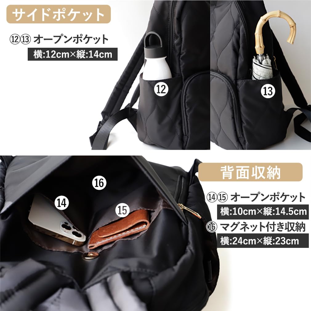 16ポケットマザーズバッグ リュック おしゃれ 親子 ペアルック お揃い コーデ 撥水 高密度ナイロン キルティング 軽量 a4 多収納 大容量 リュックサック リンクコーデ 軽い 通勤 背面ファスナー 大人 abb-g0024 Gratante