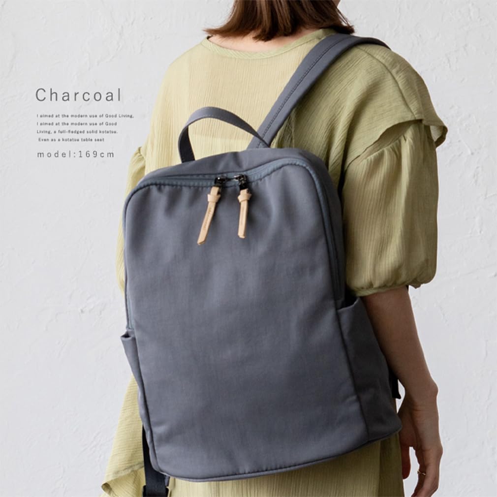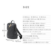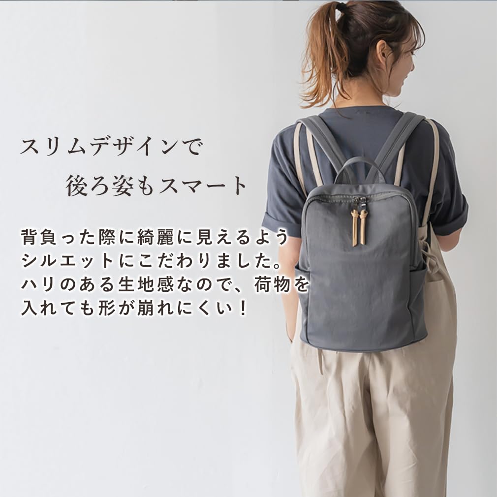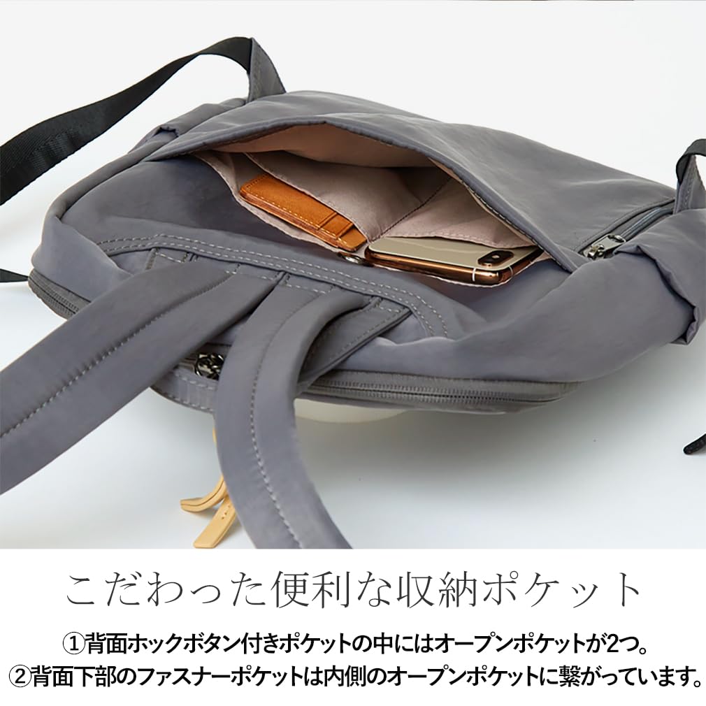 マチが大きく、見た目以上の収納力。 収納ポケットが豊富で、外側両サイドに ペットボトルや日傘などの収納に便利なオープン付きポケットがあります。 また、防犯対策にもなる便利な背面収納は、満員電車時などでも役立ちます。 バッグの中には、ファスナー付きポケットが1つ、オープンポケットが2つと 大きく仕切られた収納スペースが1つあります。 背面にあるファスナーは、バッグ内部の収納スペースへ繋がっており ゴチャつくリュックの中から必要な物だけ取りだしが可能。 メイン収納はサイドまで大きく開くファスナー仕様なので 中身が取り出しやすく中身が落ちる心配もありません。