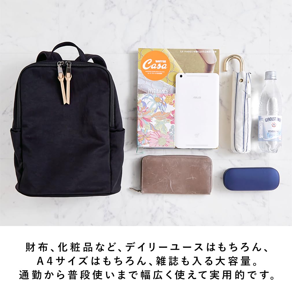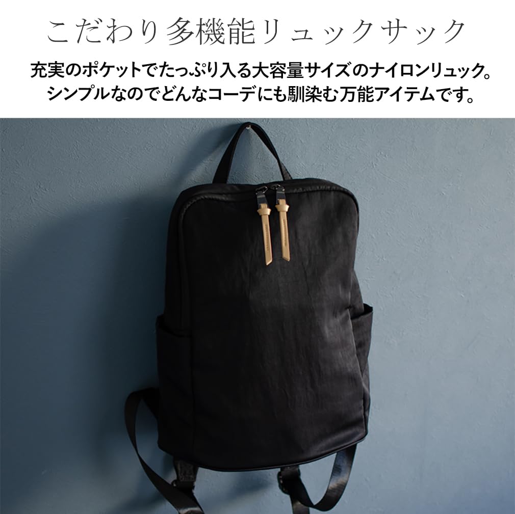 カジュアル過ぎないシンプルな見た目ながら、 機能性が充実のナイロンリュック。 コンパクトに見えてA4はもちろん、雑誌サイズも入る大容量に ポケットが全部で9か所と収納力もバツグン! ほんのり光沢感のあるナイロン素材を使用し、 キレイめで落ち着いた印象に仕上げました。 通勤や通学にはもちろん、ママバッグとしても活躍間違いなし。