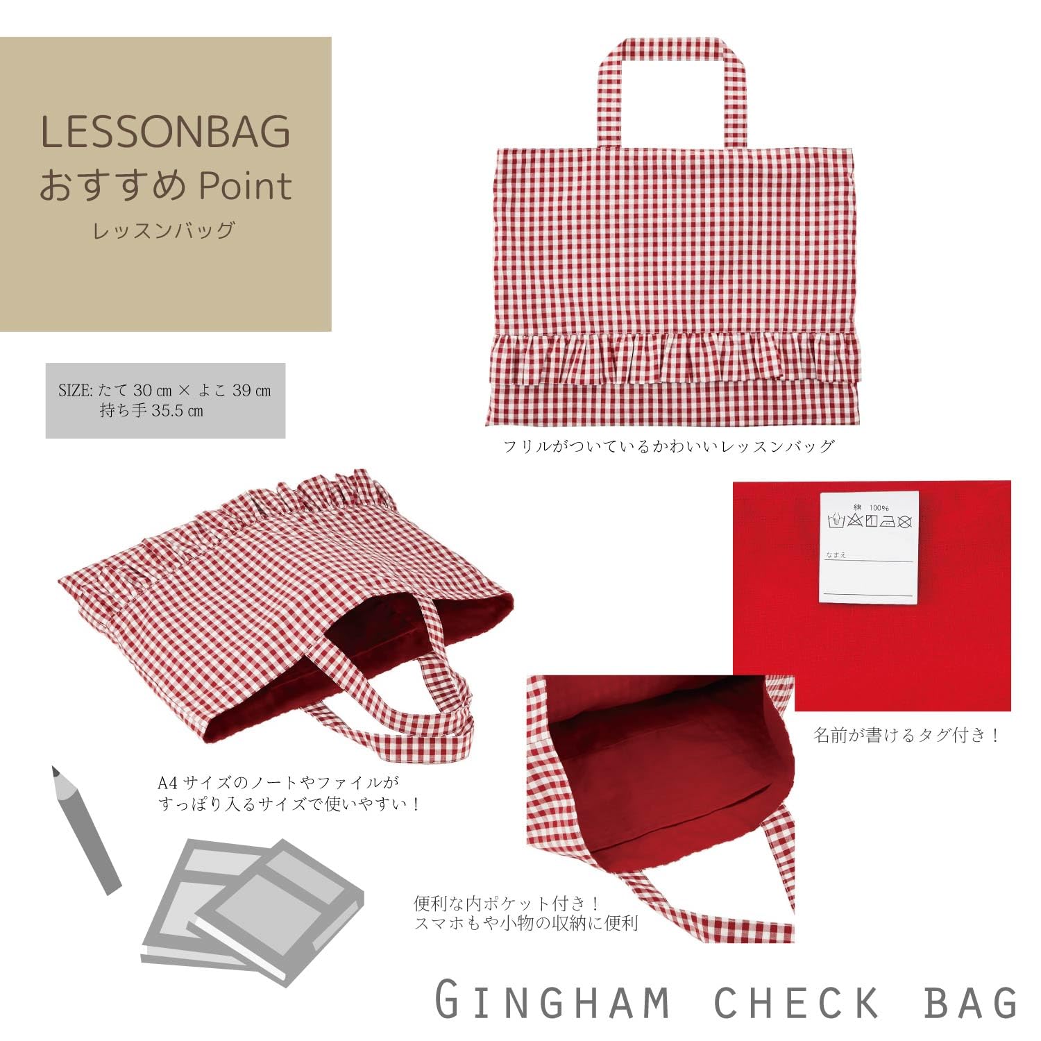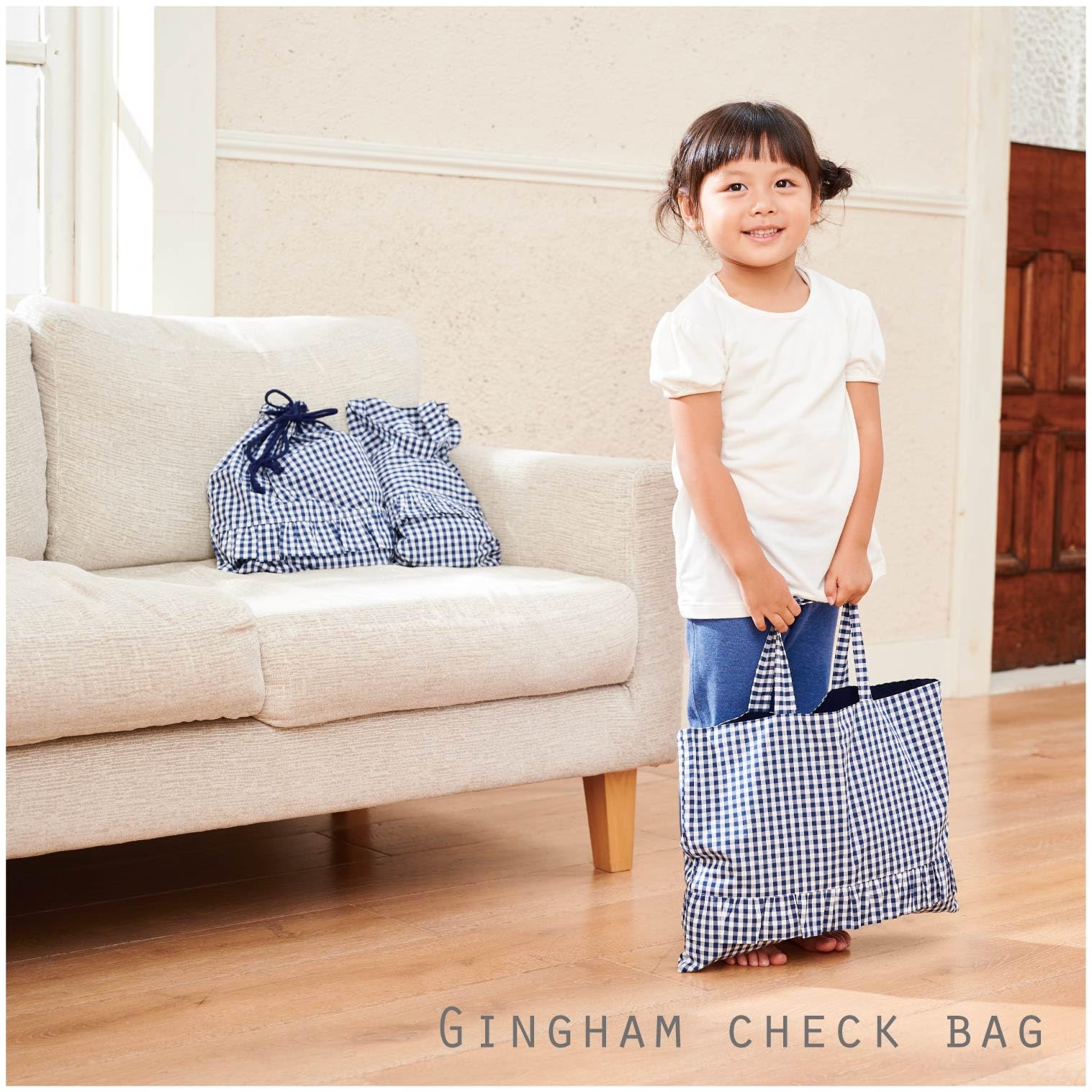 入園 入学準備 に最適な レッスンバッグ ・ 上履き入れ ・ 体操着袋 の 3点 セット。レッスンバッグの内側にはポケット付きです。それぞれのアイテムの内側には 名前 が書ける タグ 付きで便利。 入園 入学祝い にもおすすめです。アクセントに丁度良いサイズ感の ギンガム チェック の手触りの良い ブロード 生地 を使用。