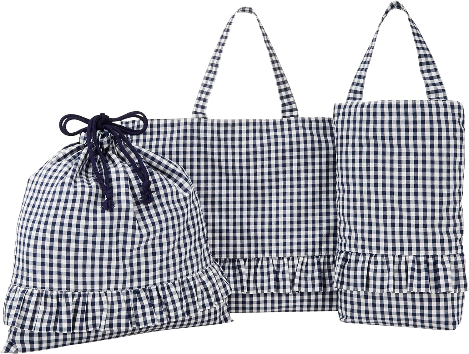 セット内容(サイズ):レッスンバッグ(横約39cm×縦約30cm×持ち手長さ約35.5cm)/内ポケット(横約18cm×縦約12.5cm)・上履き入れ(横約20cm×縦約30.5cm×マチ約5.5cm×持ち手長さ約30cm)・体操着袋(横32cm×縦約35cm)