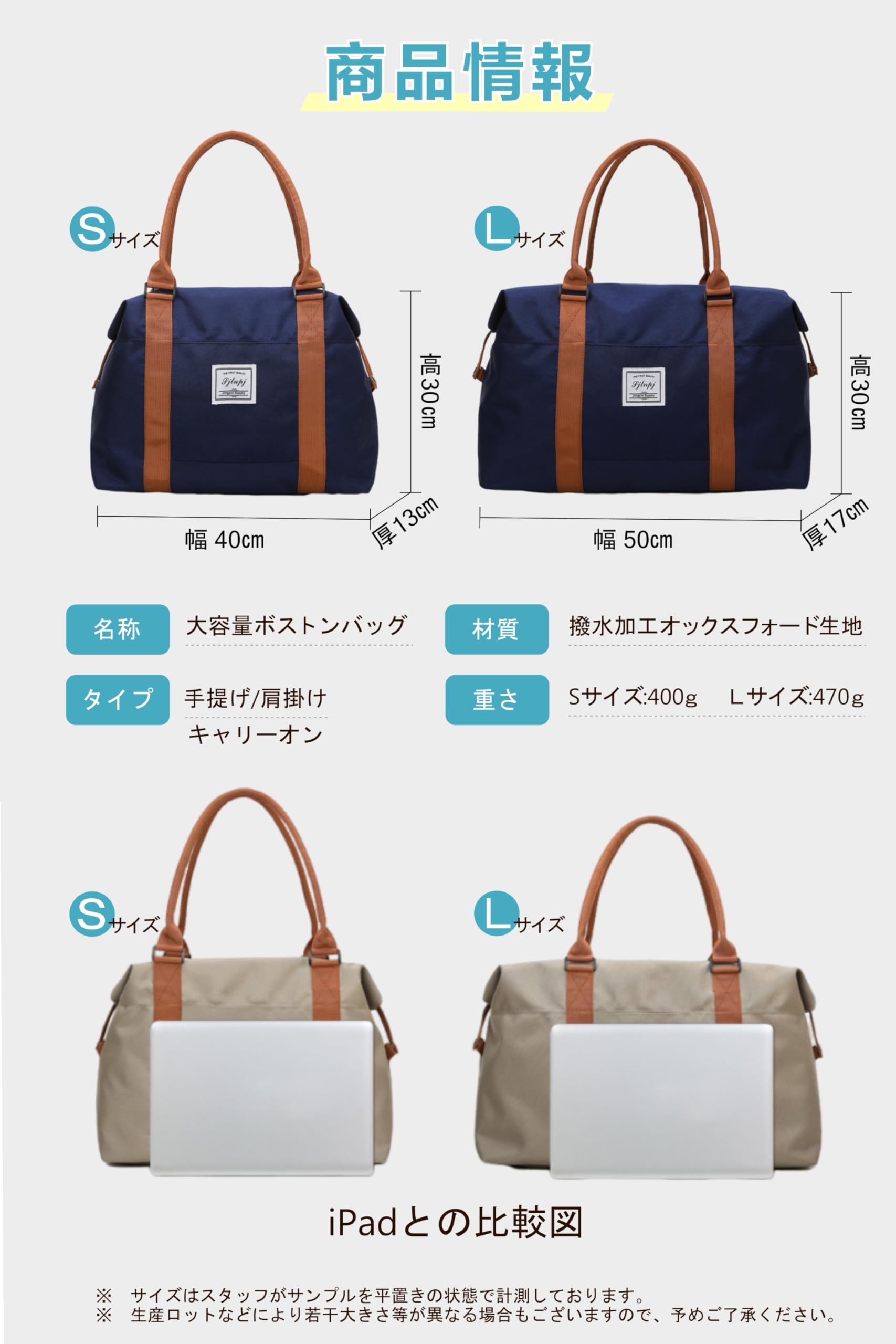 【商品仕様】■Sサイズ:高さ約30cm×幅約40cm×マチ約13cm ・重量:約400g ■Lサイズ:高さ約30cm×幅約50cm×マチ約17cm ・重量:約470g ■主な素材:オックスフォード ■カラー:ブラック、ネイビー、グリーン、レッド、ベージュの5色展開【お客様へのとサポート】ご購入後のアフターサービスにも力を入れています。万が一の不具合やご不満がある場合は、ご購入後30日以内であれば、返品対応をさせていただきます。お客様の満足度を最優先に考え、信頼のある商品とサービスを提供したいと考えております。安心してご購入いただける、おすすめのボストンバッグです。