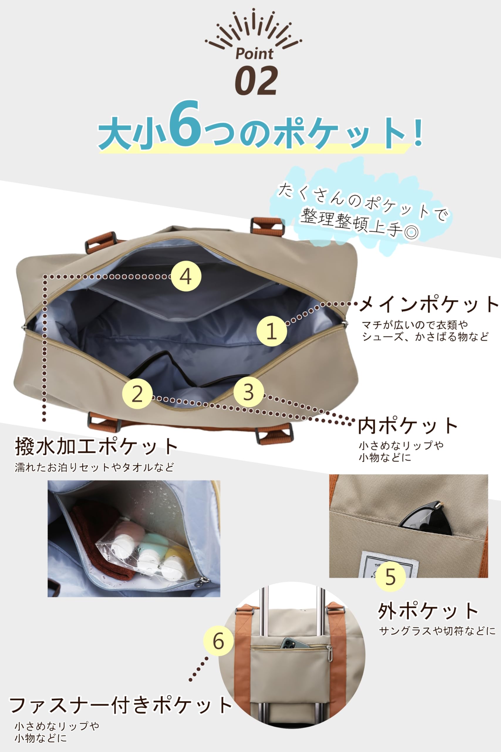 【ポケットが多く、整理しやすい】メインポケットのほかに、前ポケット・後ろポケットがあります。また、メインポケットの中には内ポケットが2つ、ファスナー付き内ポケットが1つあります。大容量であるだけでなく、多くのポケットがあることで荷物の整頓もしやすいカバンです。また、ファスナー付き内ポケットは撥水加工されているポケットとなっています。