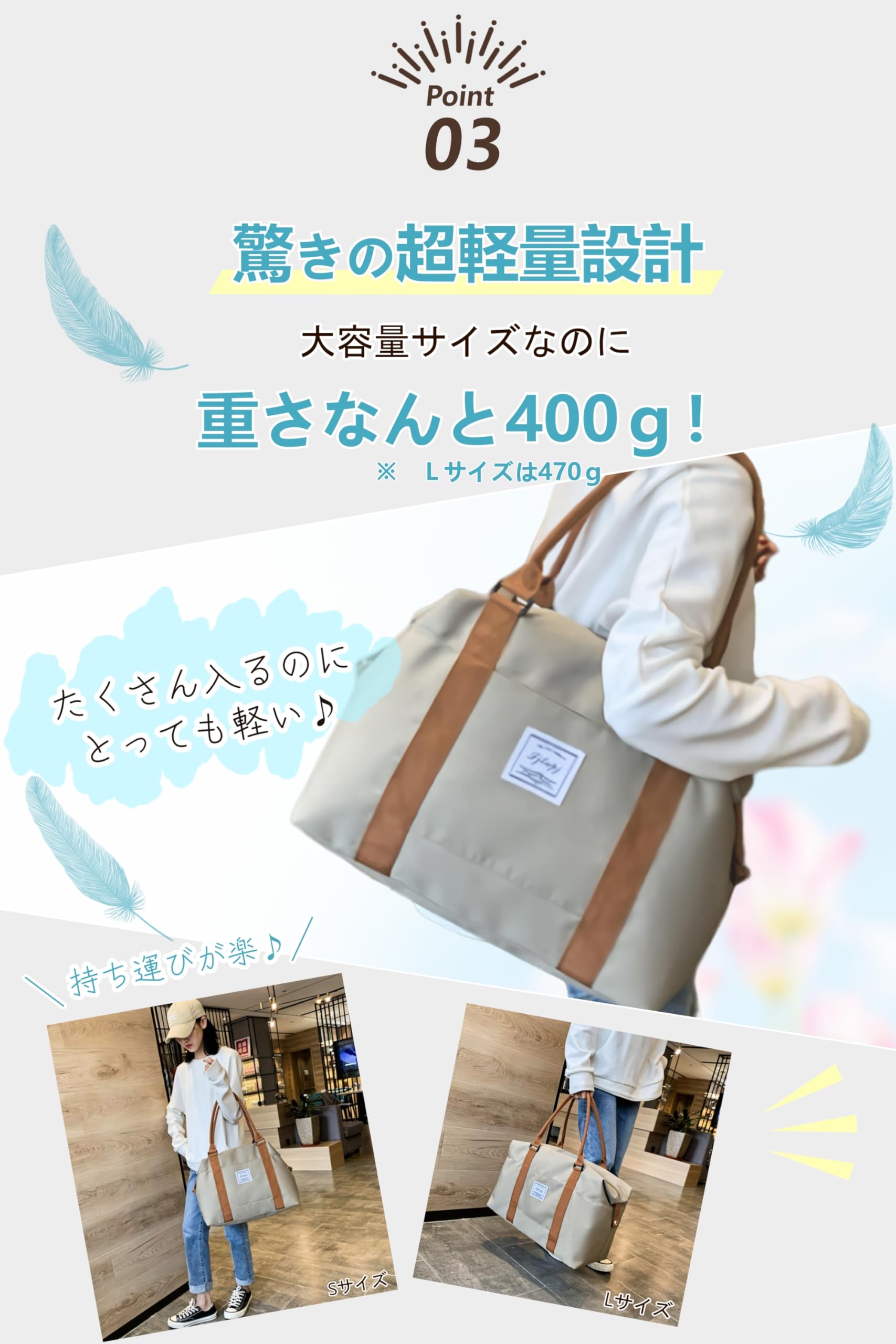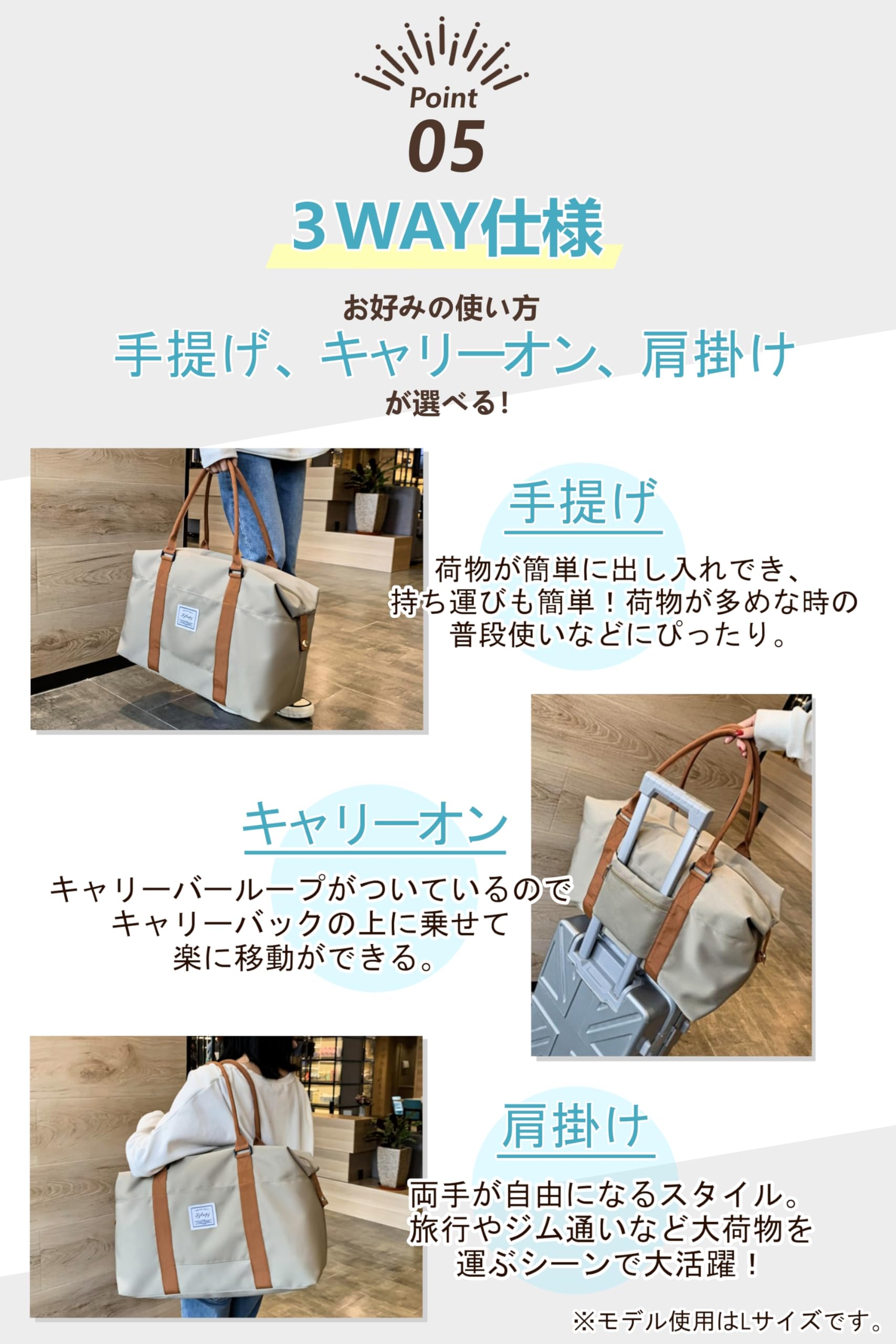 【軽くて大容量】ボストンバッグ 旅行バッグ メンズ レディース 軽量 大容量 キャリーオンバッグ 機内持ち込み 1泊 2泊 (ベージュL)
