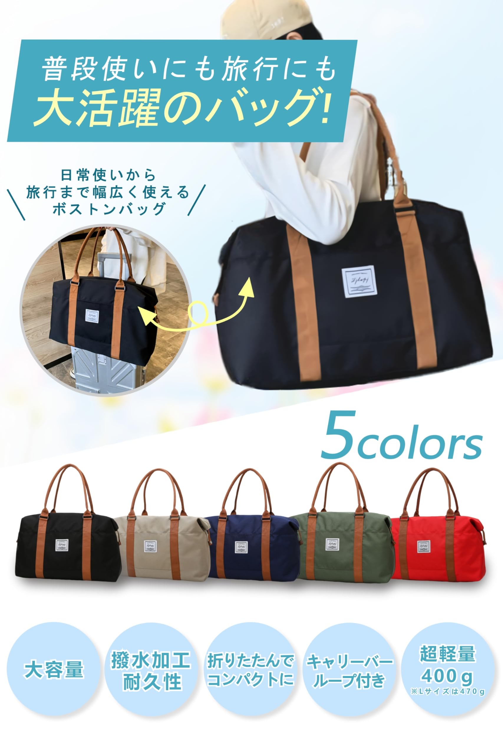 【コンパクトなのに軽くて大容量】軽量なのにたくさん荷物が入る便利なボストンバッグです。マチが広くて見た目以上に荷物が入ります。旅行バッグとしてはもちろんのこと、軽量で、折りたたむとコンパクトになるため、旅行先で使うサブバッグとして持ち歩くのにも最適です。また、トラベルバッグとしての利用だけでなく、ジムバッグとしてのご利用もおすすめです。