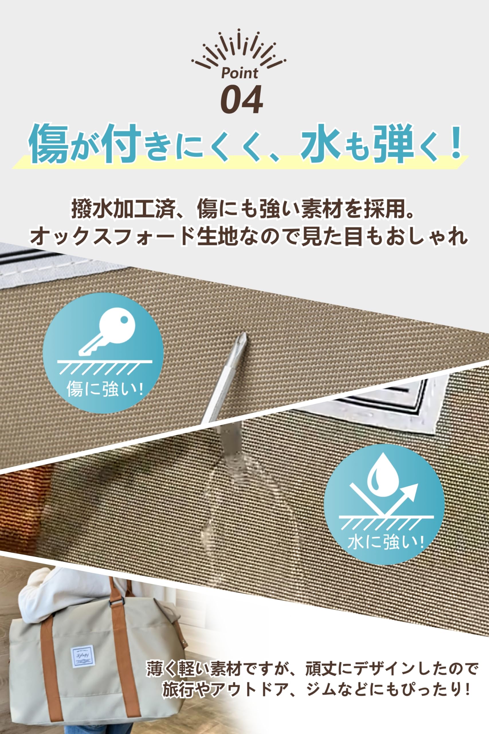 【撥水性・耐久性のあるオックスフォード生地】防水性の高い撥水加工されたオックスフォード生地を使用しているため、丈夫で、軽い雨であれば水濡れを防ぐことができます。旅行用のトラベルバッグ、サブバッグとしての使用だけでなく、キャンプなどのアウトドアにもおすすめです。