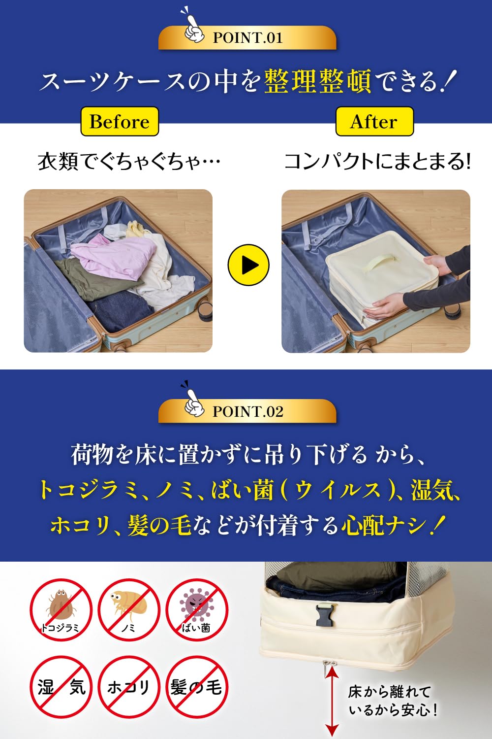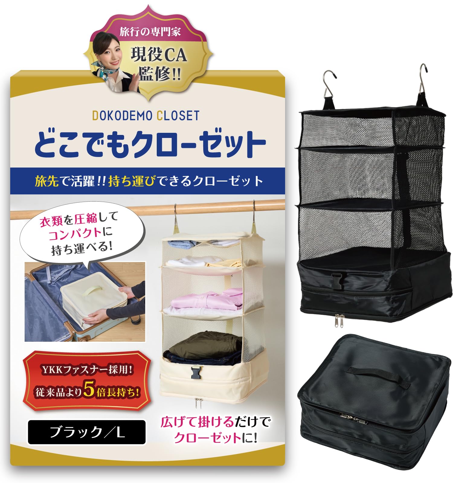 【耐久性UP!従来品より5倍長持ち】ファスナーには信頼と実績のYKK製品を採用しました!耐久性がUPしたことで従来品より5倍長持ちするようになりました(当社比)。 【吊り下げ型だからトコジラミやノミなど害虫の心配なし】「宿泊先でトコジラミやノミが気になって、衣類を床に置きたくない」という方に最適!床に置かずに吊り下げるクローゼットのため、トコジラミやノミなどに関しての心配は無用です。