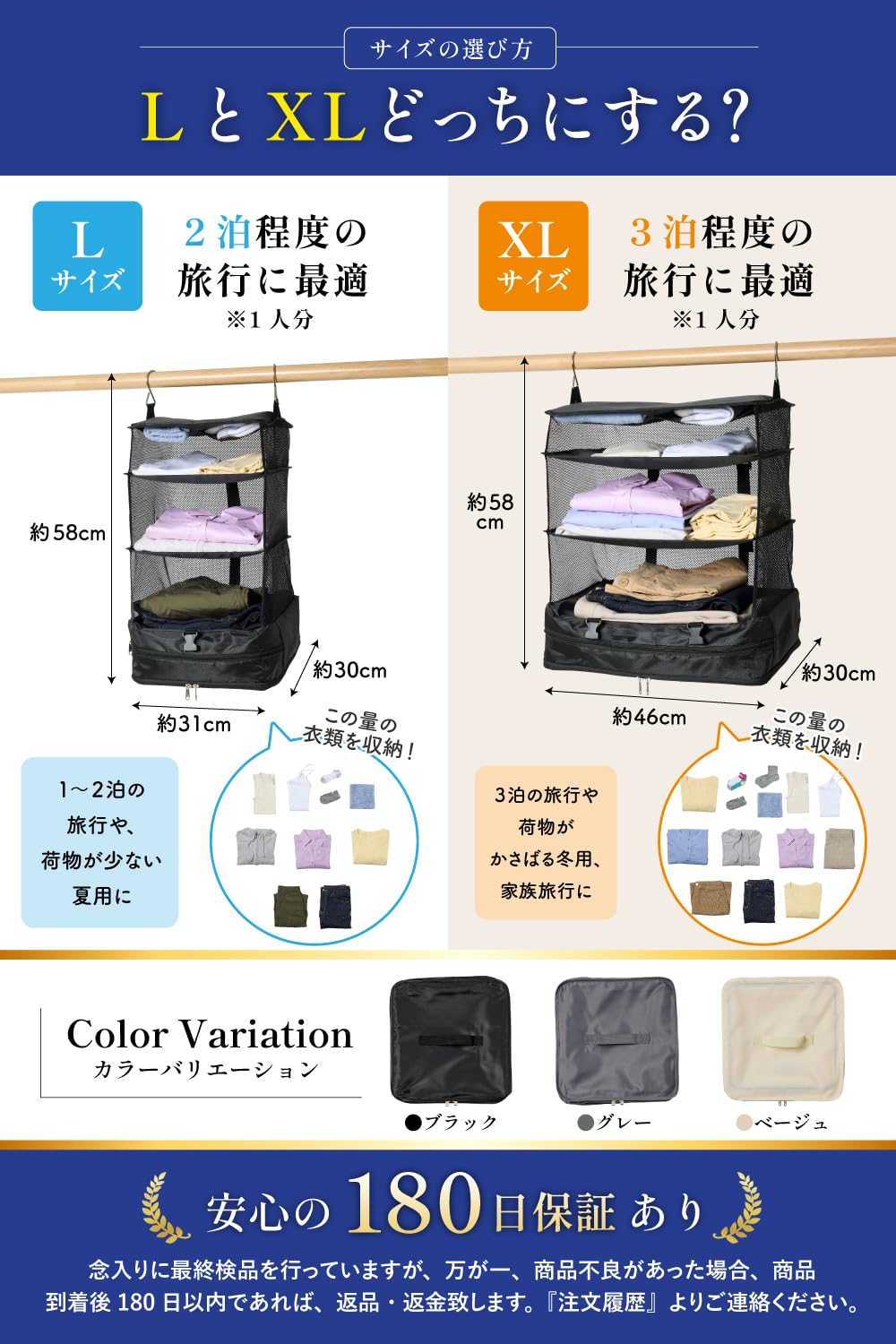 【選べる2サイズ】LサイズとXLサイズの2サイズをご用意!Lサイズは1〜2泊程度の旅行(1人分)や荷物が少ない夏用におすすめ。XLサイズは3泊程度の旅行(1人分)や荷物がかさばる冬用、家族旅行におすすめです。