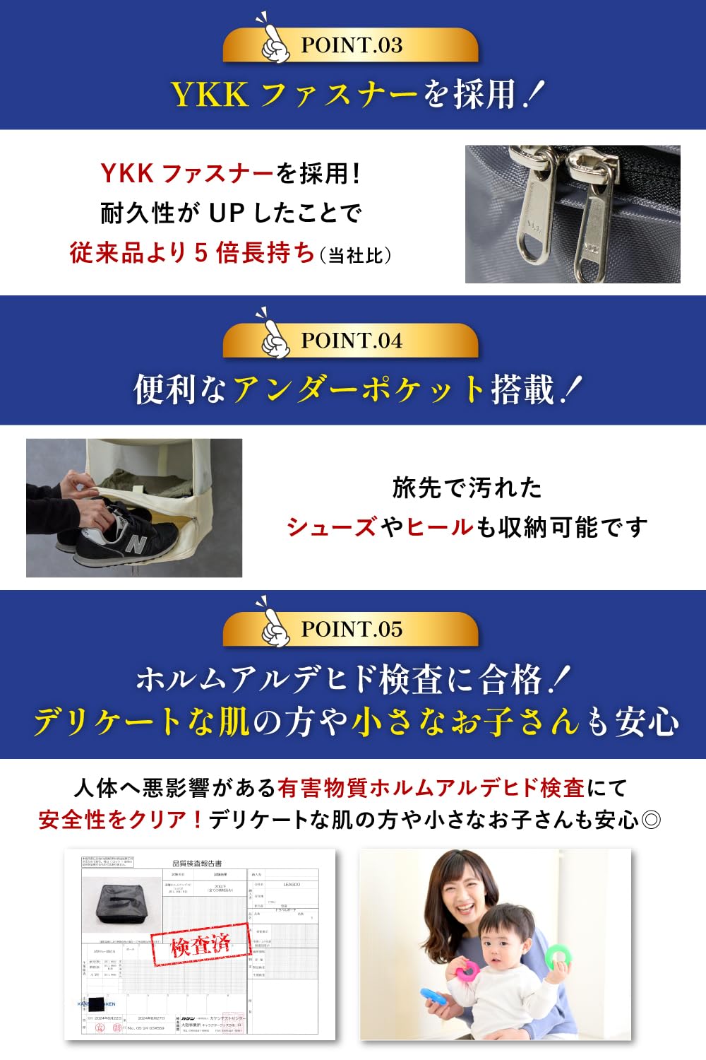 特徴 YKKファスナー, 吊るせる, 折り畳み式, 真空密封, 防湿性