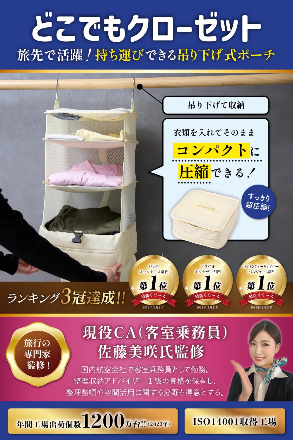 【旅行の専門家監修!持ち運びできるクローゼット】現役CA(客室乗務員)佐藤美咲氏監修のLEAGOO『どこでもクローゼット』。衣類を圧縮してコンパクトに収められるトラベルポーチで、さらに宿泊先で広げて掛けるだけで自分専用のクローゼットに早変わり!「旅行や出張に行く機会が多い」「スーツケースがパンパンになってしまう」「旅先に衣服をたくさん持っていきたいけど、スーツケースに収納するのが大変&面倒」そんな方におすすめの便利グッズです。アンダーポケットも搭載!旅先で汚れたシューズやヒールも収納可能です。