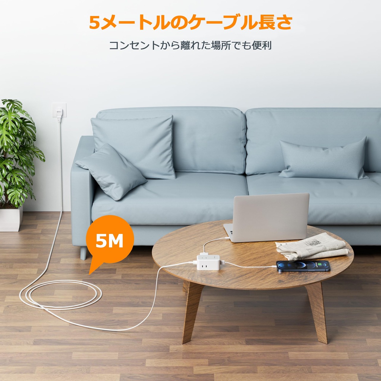 【使用便利】タコ足コンセントのケーブルが5mと長いため、コンセントから離れた場所でも便利。それに、180°スイングプラグで、狭い場所での使用にも対応しています。