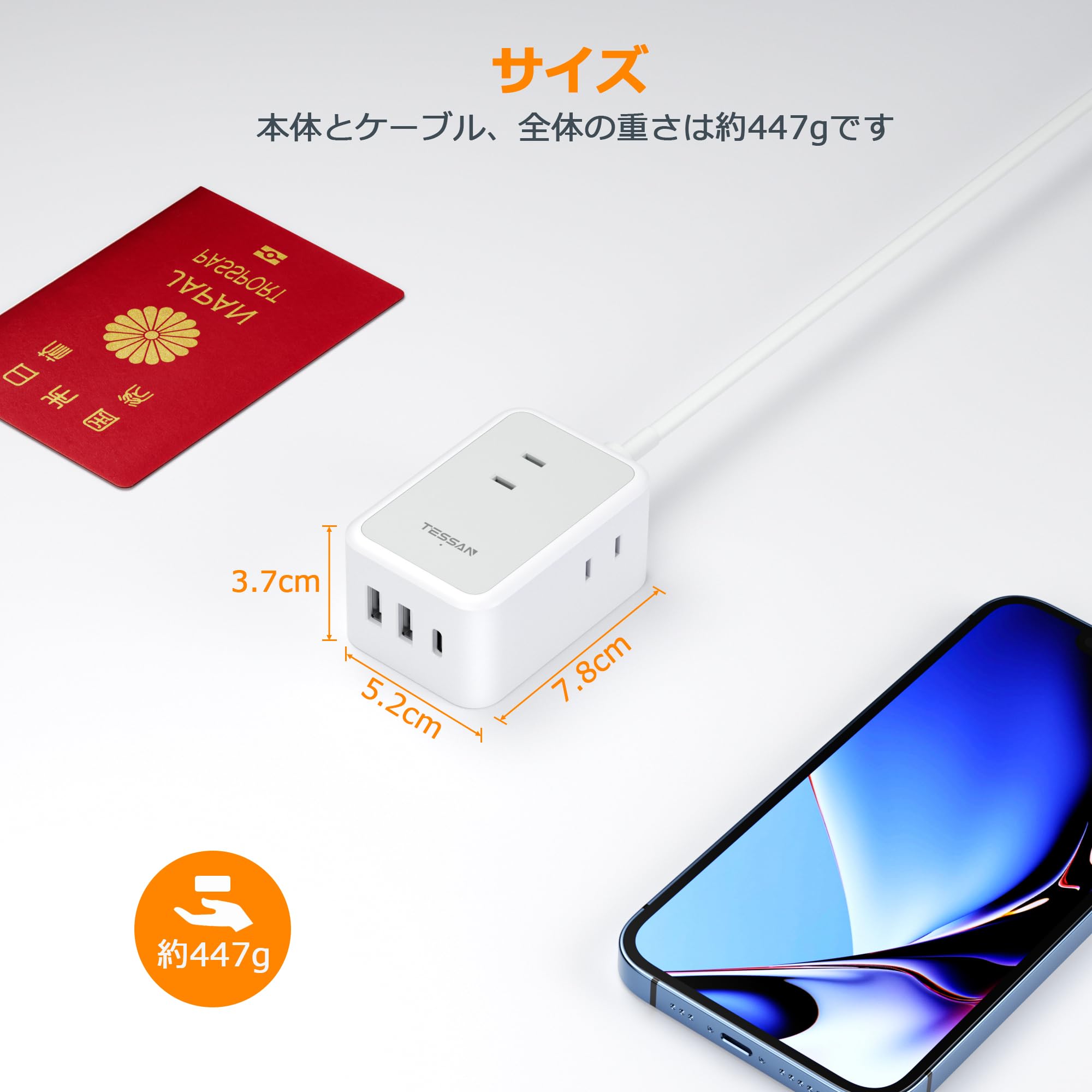 延長コード 5m 電源タップ usb たこあしコンセント テーブルタップ TESSAN 3個ACコンセント 1個type-c 2個タイプAポート タコ足配線 電源コード マルチ スイングプラグ oa 壁掛 卓上