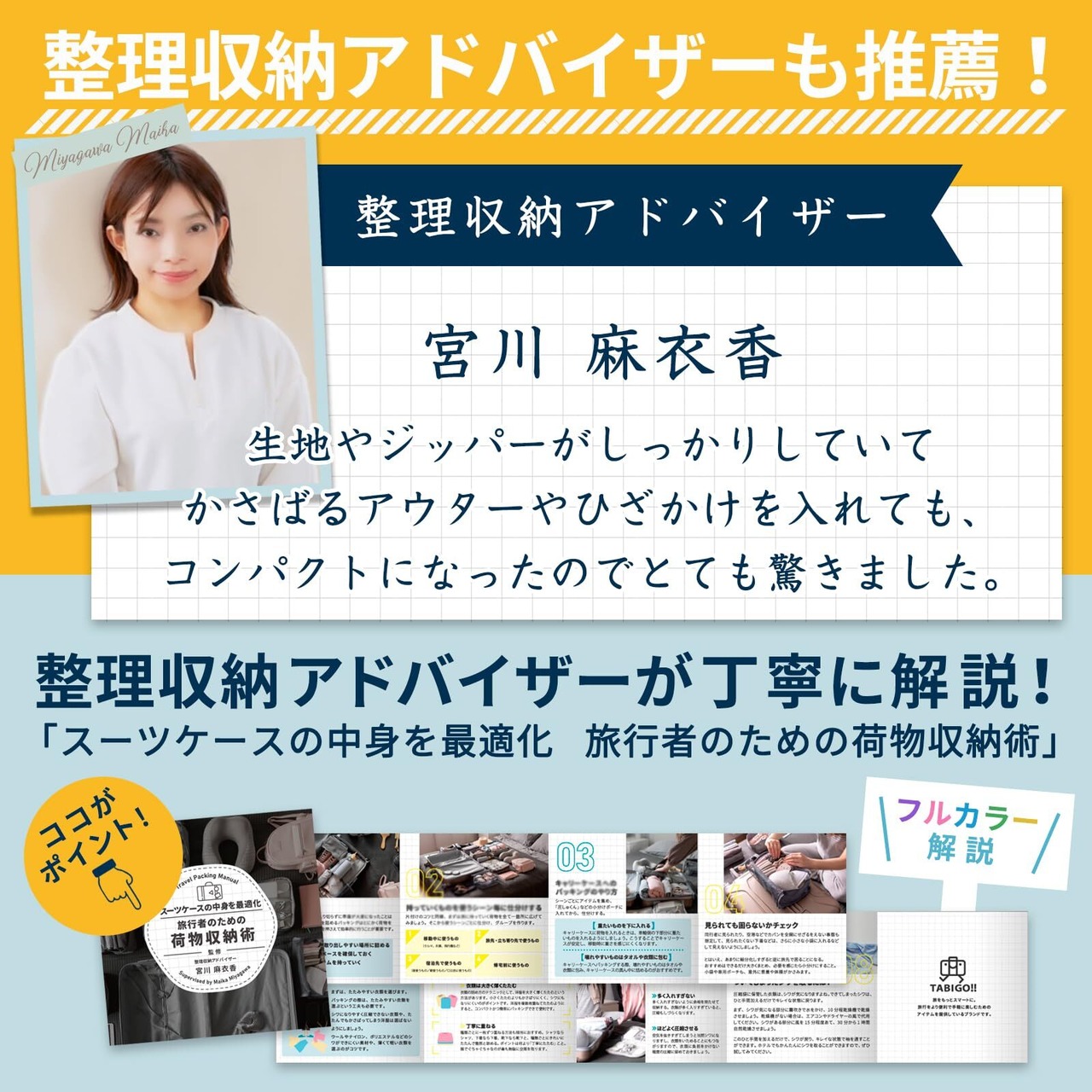【整理収納アドバイザー推薦】 整理整頓のプロ 宮川麻衣香さんも推薦「生地やファスナーがしっかりしていて、かさばるアウターやひざかけを入れてもコンパクトになったのでとても驚きました。」また整理収納アドバイザー監修のスーツケースの中身を最適化するための荷物収納術も付いています。