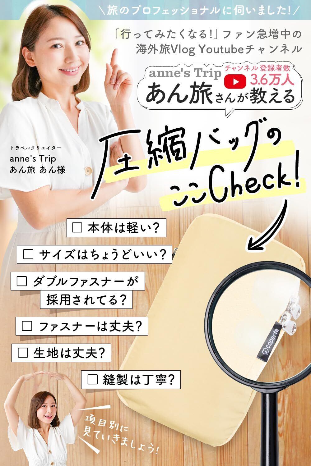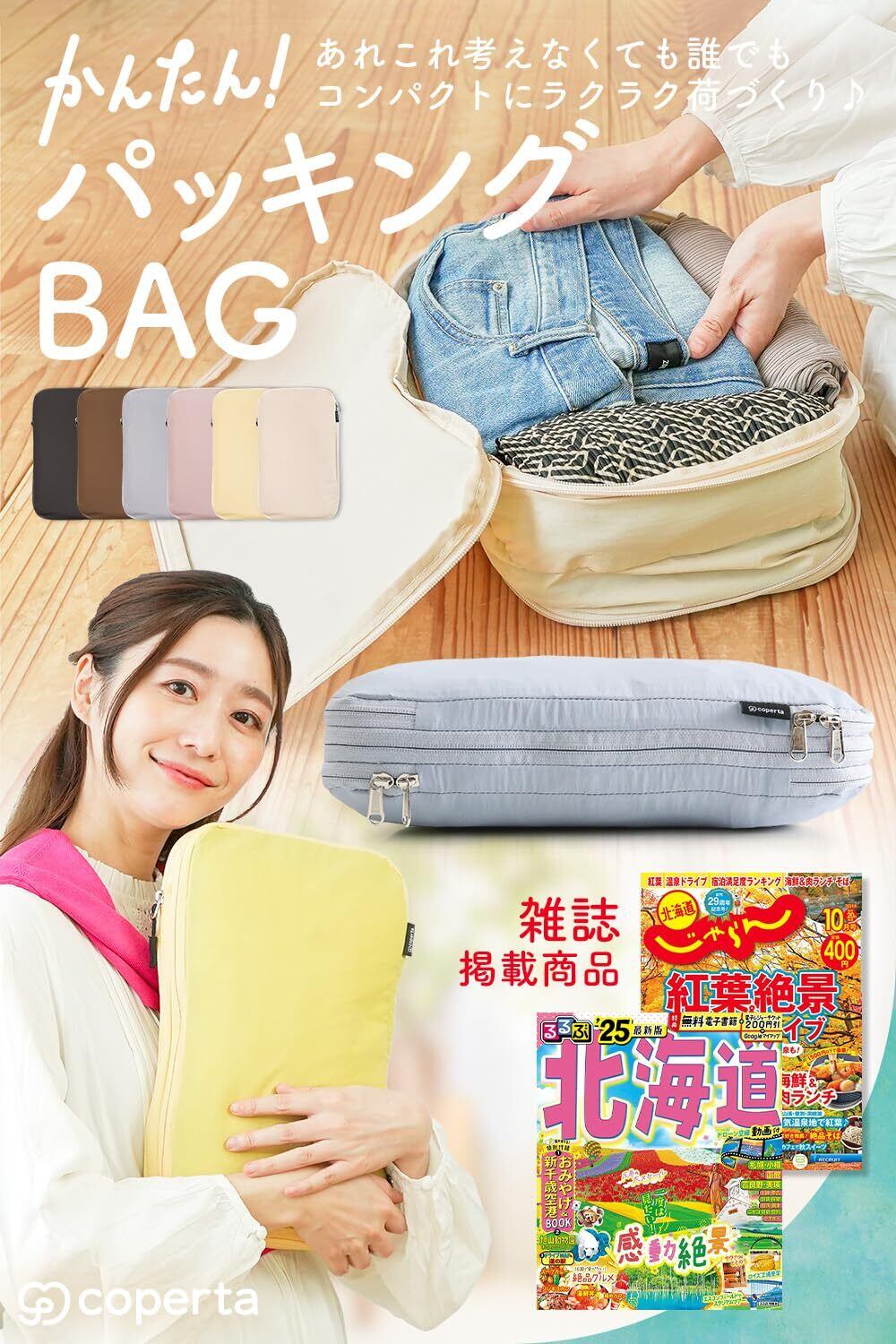 【コペルタから旅行用トラベルバッグが初登場!】 お待たせしました!コペルタから新たにアイデアをたくさん詰め込んだ旅行用のかわいい圧縮袋が新登場!よりお買い物しやすく、そして使いやすく、をモットーに、皆様からのご意見を参考にさせていただいて開発しました