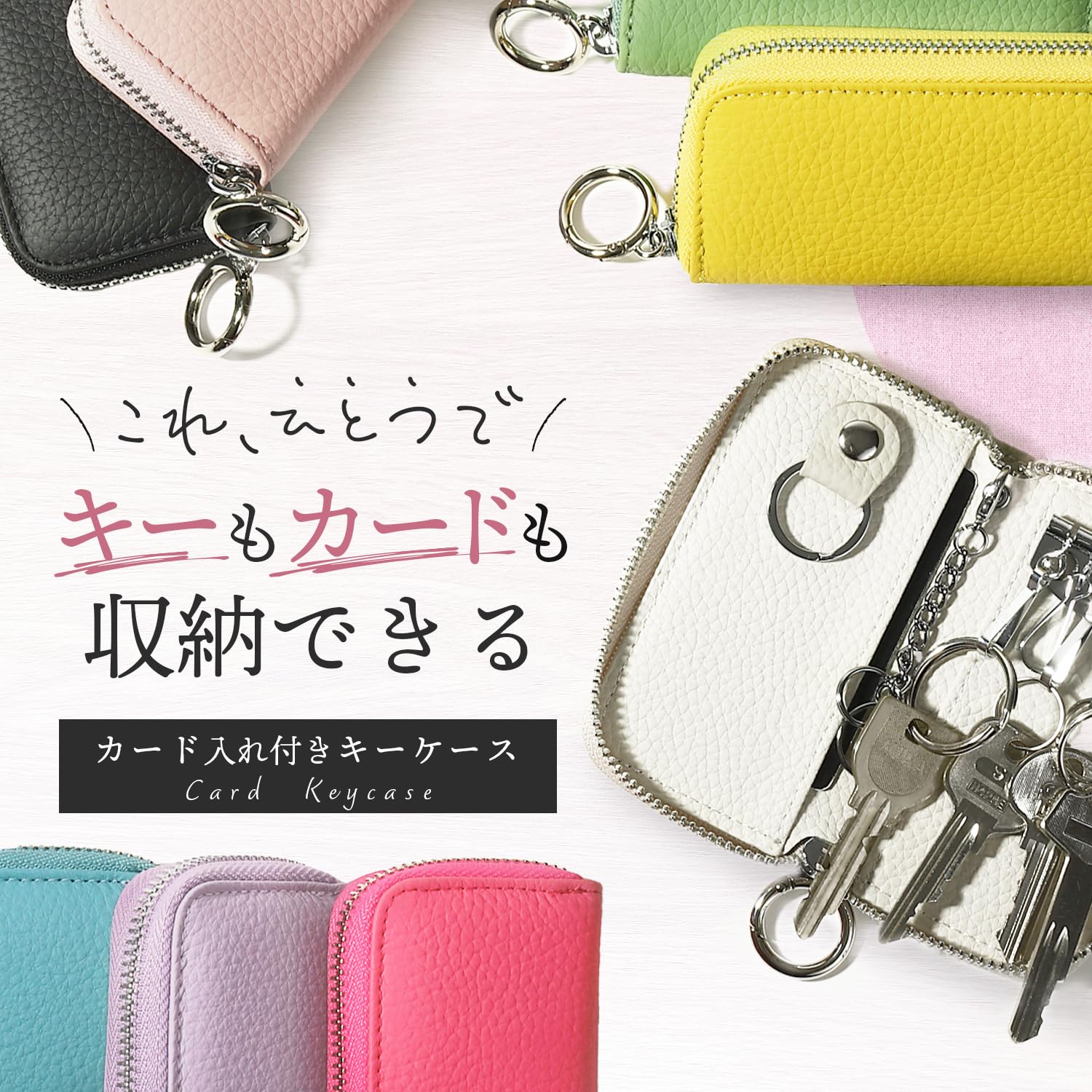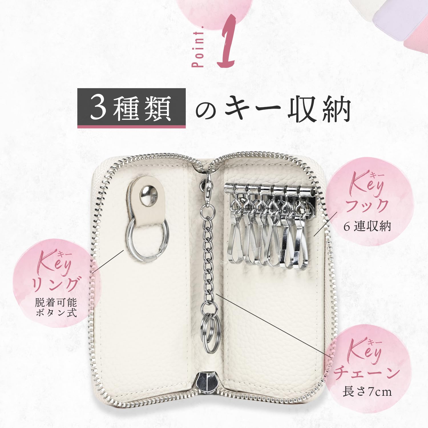【抜群の収納力】①6連キーフック、②脱着可能なキーリング、③チェーン付きキーリング。通常の鍵はもちろん、スマートキーも収容可能。また、内側にカードポケットが2つあります。カードキー、交通系カード、クレジットカード、免許証、お札を一緒に持ち運べるのでとっても便利。