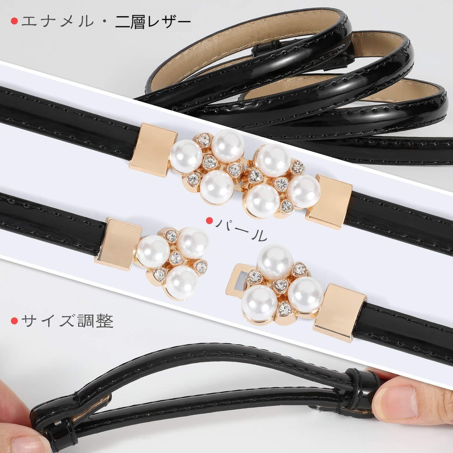 【特価商品】[JASGOOD] 細ベルト レディース スカートベルト エナメル ウエストマーク スライドベルト パール パーティ ウェディング 結婚式 ドレス ワンピース コーデ サイズ調整可能(ジャスグッド) ブラック | nico3588