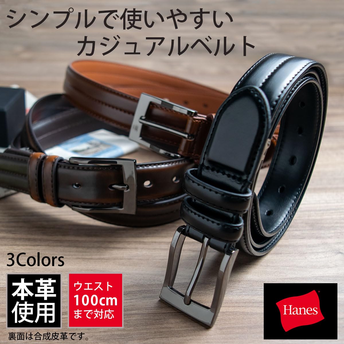 [Hanes] [ヘインズ] メンズベルト 本革 【ウェスト100㎝対応】 ピンタイプ