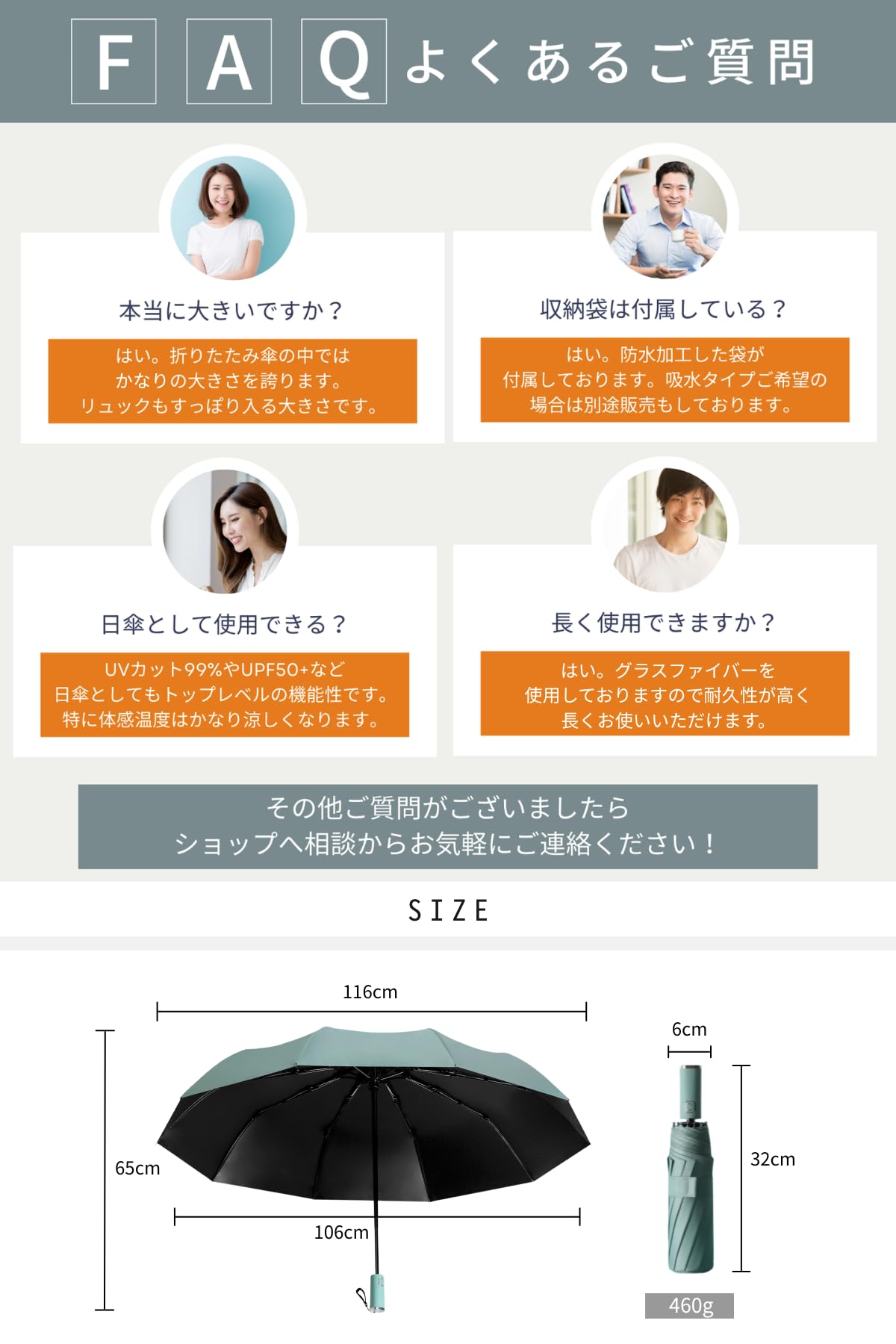 【 99%UVカット/ UPF50+ 】季節問わずにUVは肌の敵です。この折り畳み傘は日傘として99%UVカットに加え、UPF50+の機能性を工場にて認可されており、紫外線から肌を守流ことができる日傘です。