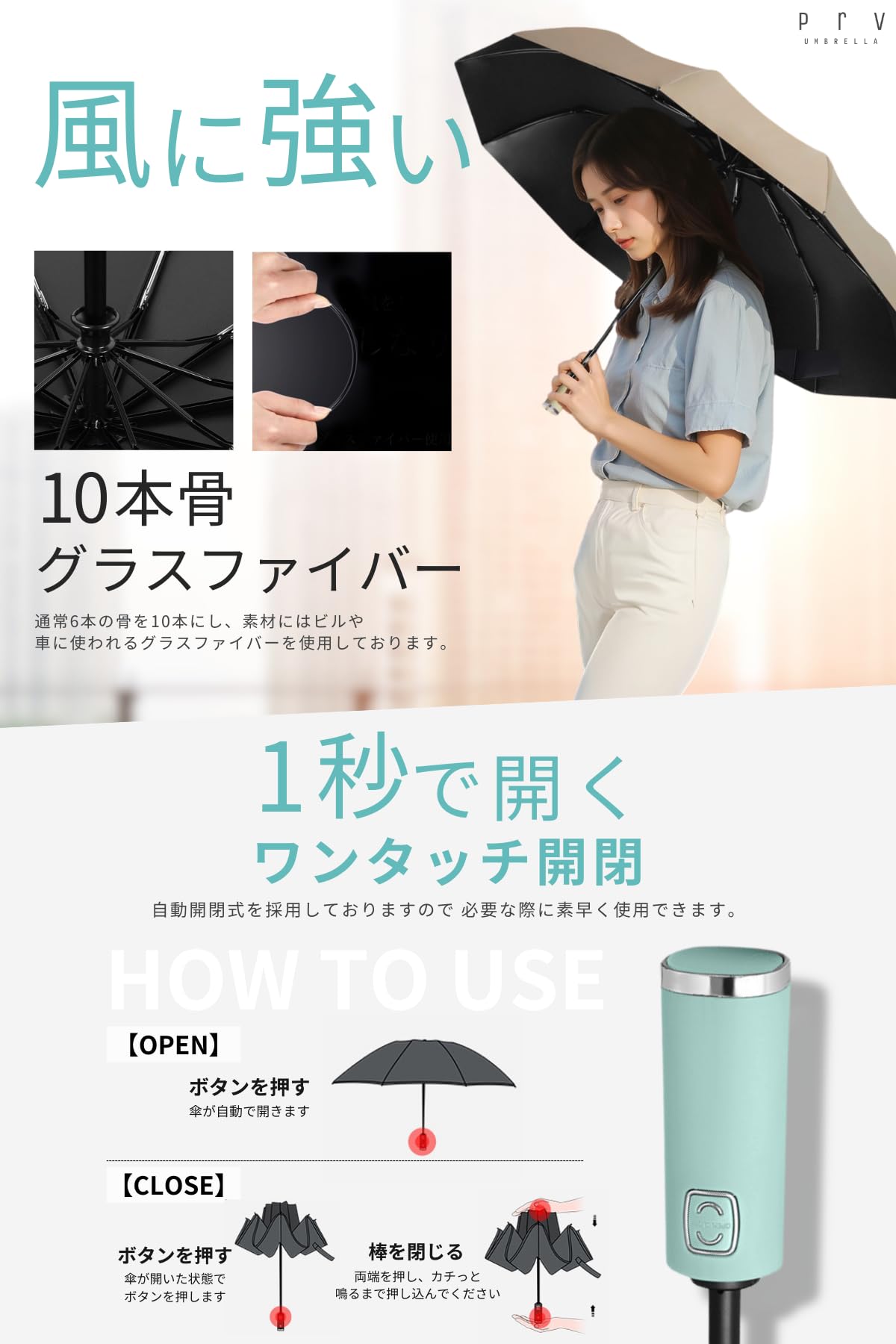 【 1秒で開く! ワンタッチ自動開閉 】Prvの折りたたみ傘は自動開閉機能を備えていますので、片手でワンタッチ操作できます。持ち手についているボタンを押すだけで傘の開閉ができますので車やバスなどの乗り降りの際や、荷物で片手が塞がっているときに非常に便利です。また持ち手も大きい設計ですので持ちやすい作りになっております。