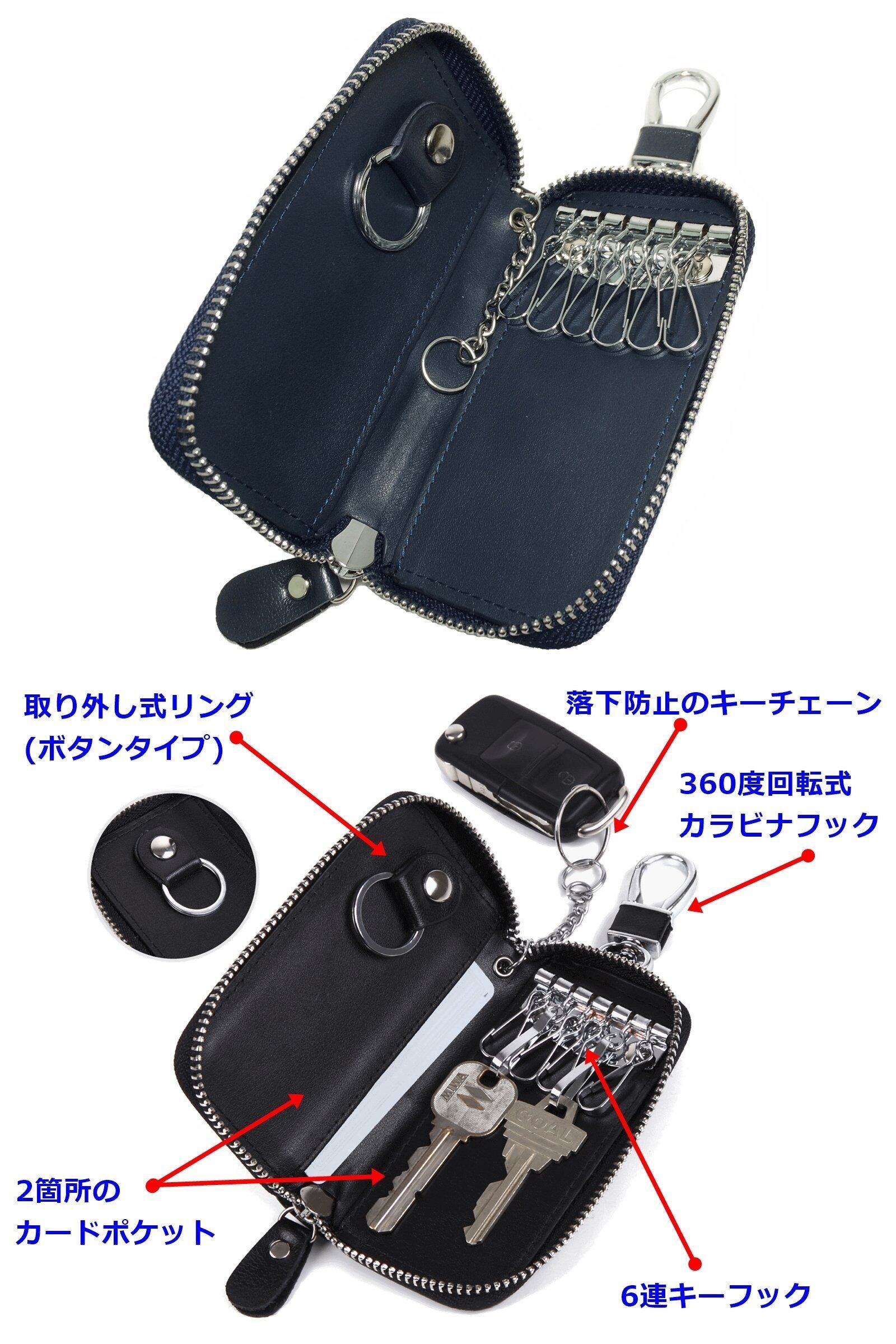 機能面ではラウンドファスナー、6連キーフック、取外し可能なボタン式リング、リング式チェーン、2箇所のカードポケット、360度回転式カラビナフックを装備しており、車の鍵、スマートキーにも対応します。