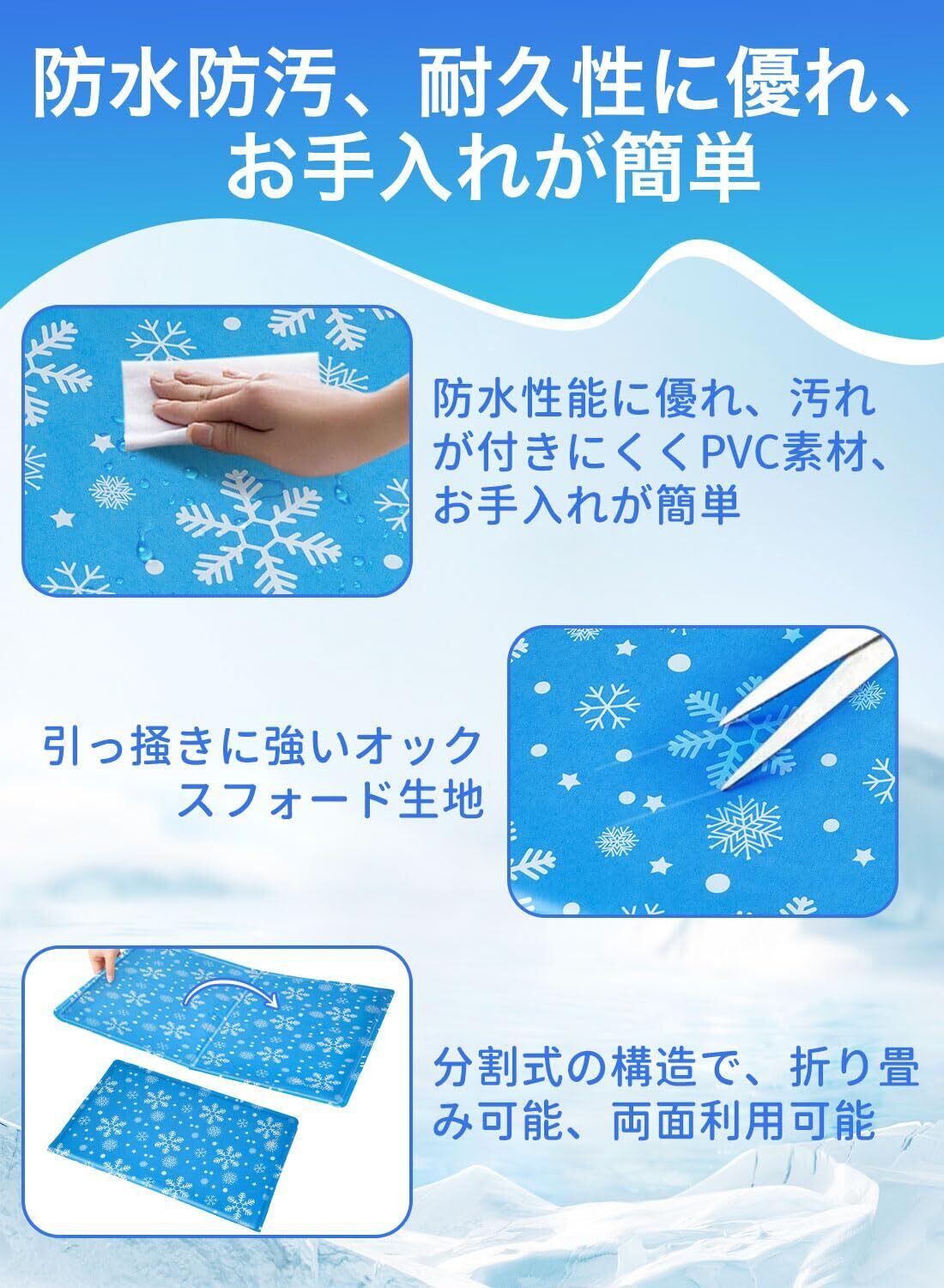 ❄️ 【耐久性・防水性・お手入れ簡単】ひんやりマットは環境に優しく耐久性のある高品質生地で作られており、二重縫製で、ジェル漏れを防止します。表面は防水性で水や汗、おしっこが染み込むのを防ぎます。汚れた場合は水で湿らせた布で簡単に拭き取ることができます。