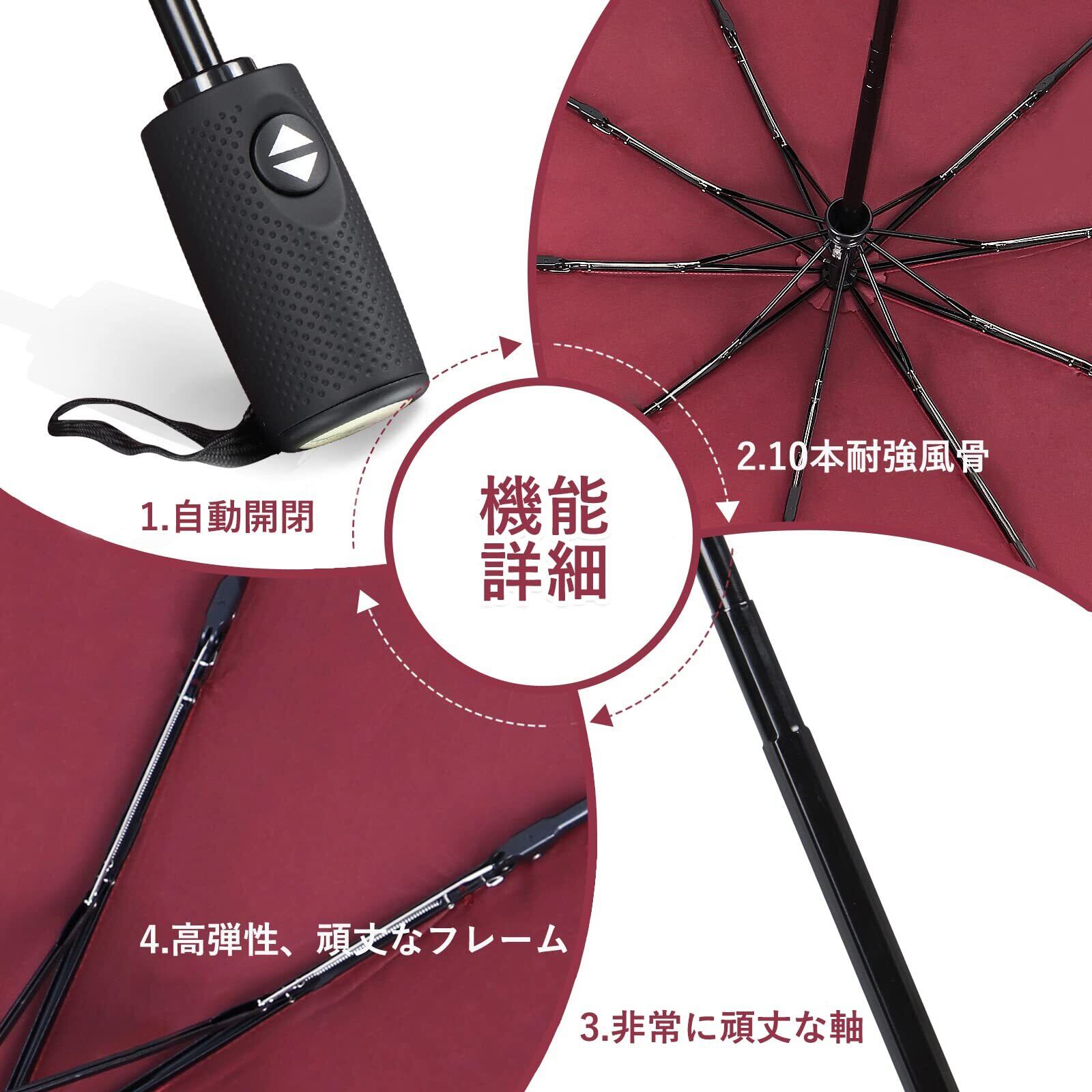 【自動開閉】ボタンひとつで開閉できる自動傘です。 片手で1秒で操作でき、ボタンを押すだけで傘を広げたり折りたたんだりできます。