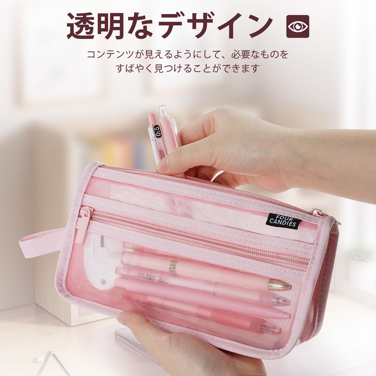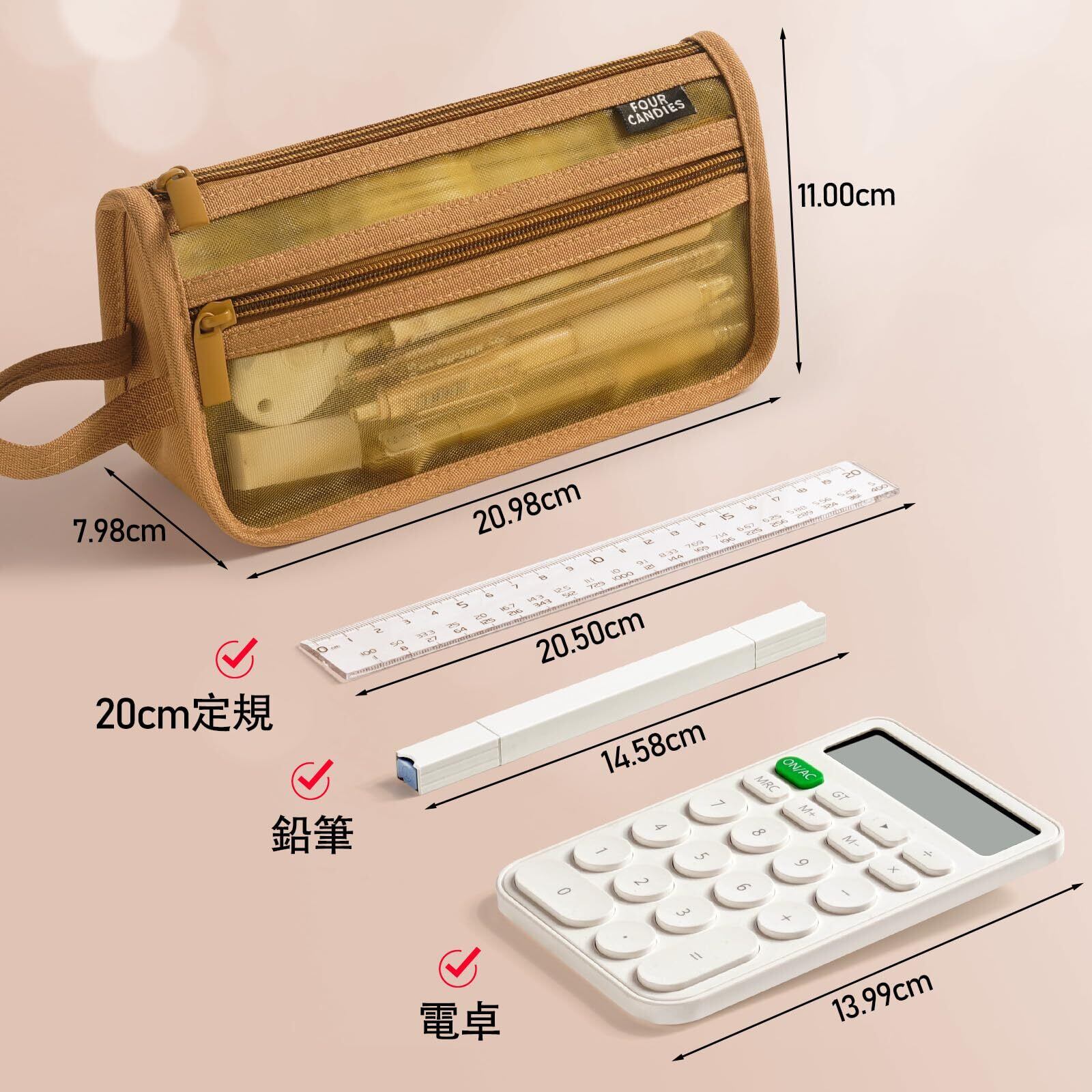 【在庫セール】Four Candies ペンケース 筆箱 透明 メッシュポーチ 大容量 ハンドルとジッパー付き クリアダブルレイヤー筆箱 マーカーポーチ 旅行化粧バッグ 女の子 男の子 大人のオフィスや学生のための可愛い透明文房具‐ブラウン